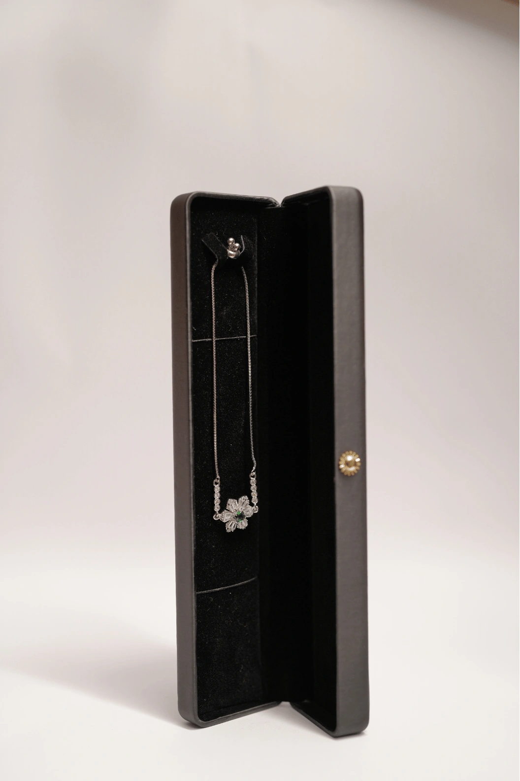 The Exquisite Flower Shaped Adjustable Silver Bracelet centers around a flower motif set with a green stone that adds a subtle pop of color. The rhodium plated finish gives it a lasting silver tone that stays bright with regular wear. The adjustable band fits a range of wrist sizes and sits comfortably throughout the day. Versatile enough to wear with casual outfits and refined enough for weddings and formal events. A clean, wearable piece with a detail worth noticing.