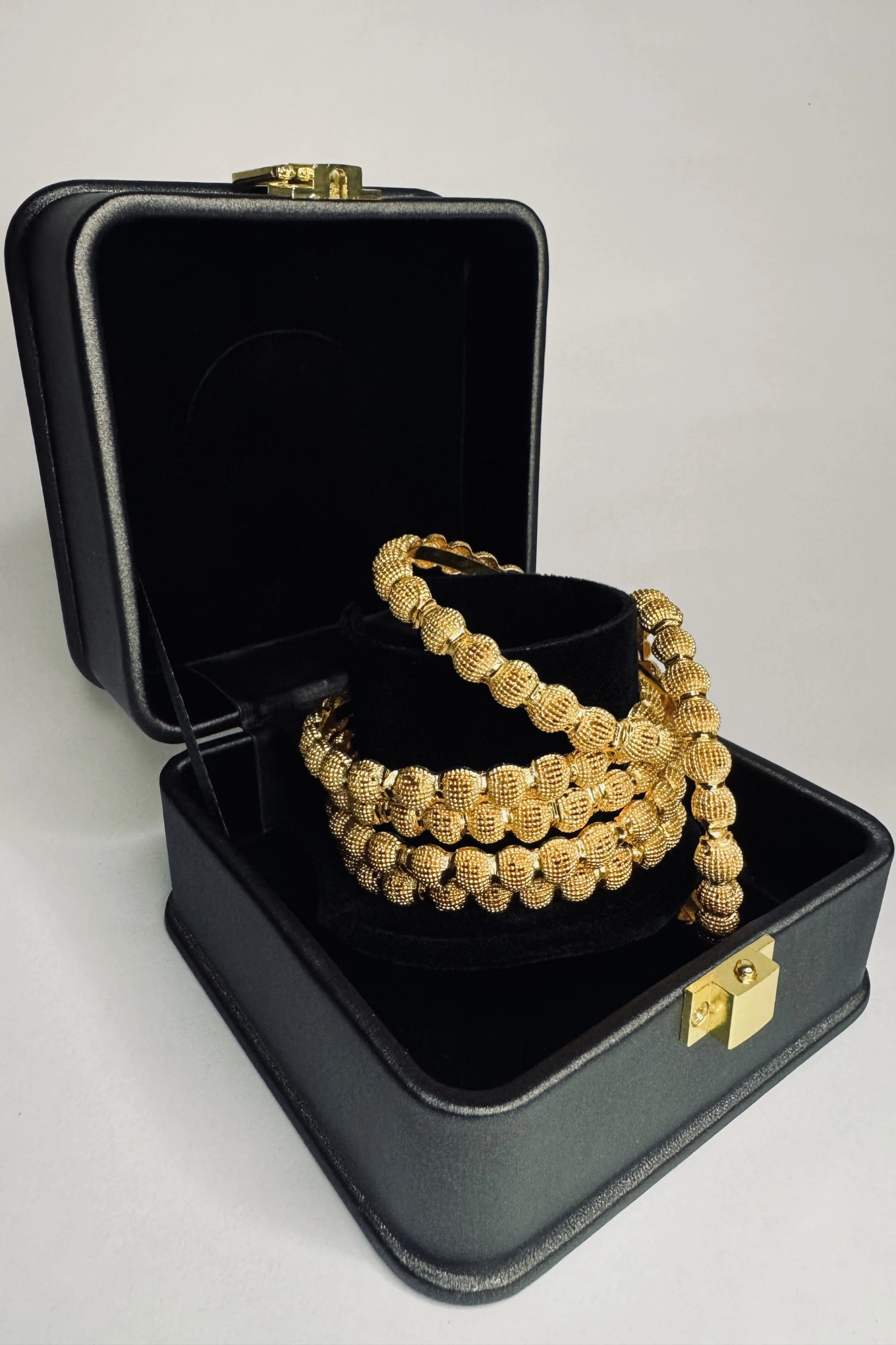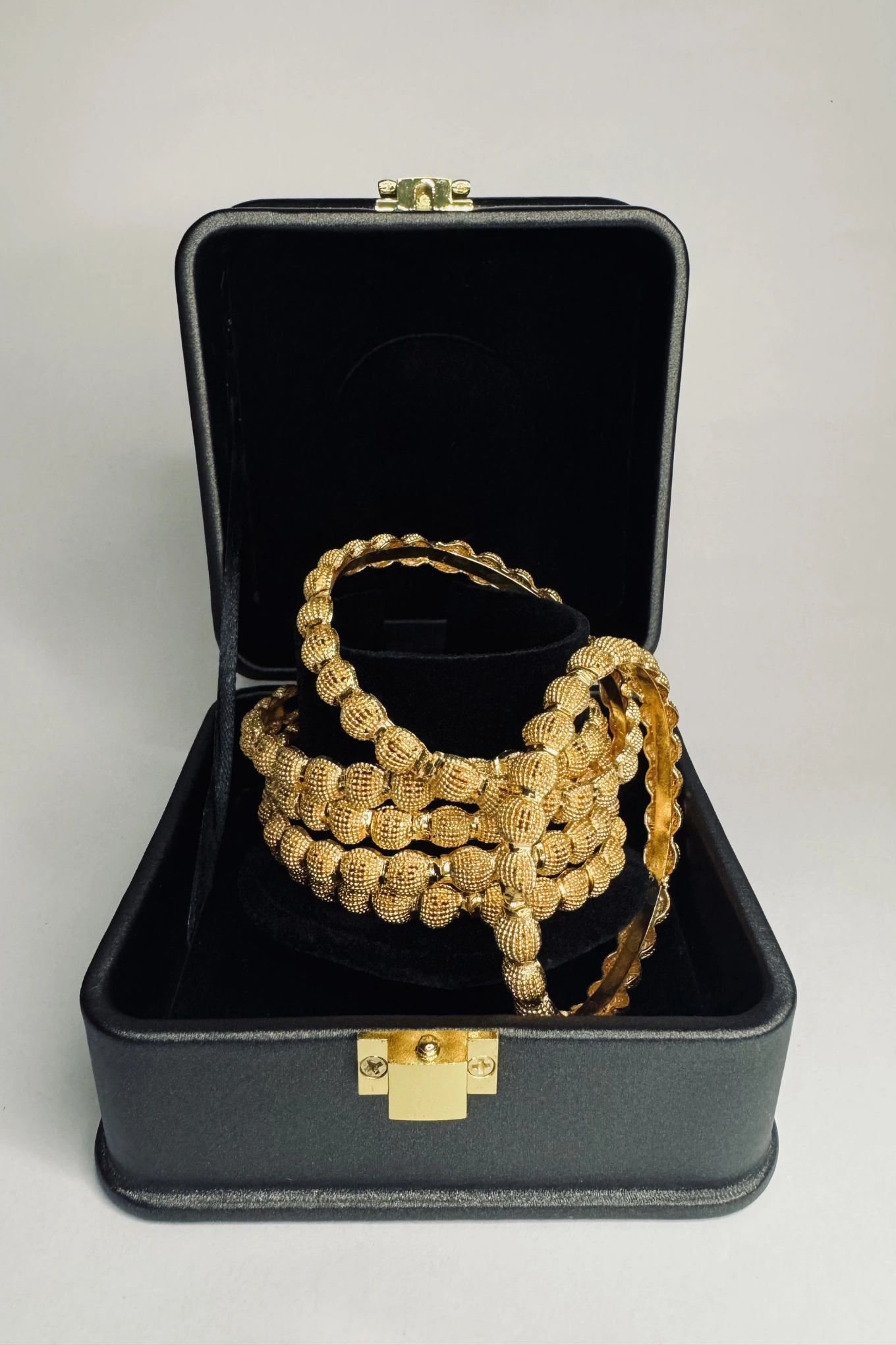 The Gold Plain Bangle is crafted in gold plated brass alloy with a clean, unembellished surface that lets the quality of the gold plating stand on its own. At 2.5 inches inner diameter, it fits a standard wrist with a secure, comfortable hold. A versatile piece that works as a standalone statement or stacked alongside embellished bangles for contrast. Suited for brides and guests who prefer a minimal, refined look without stone detailing. Not recommended for daily wear. Please note that pictures are close ups to show details of design and are not indicative of actual size.