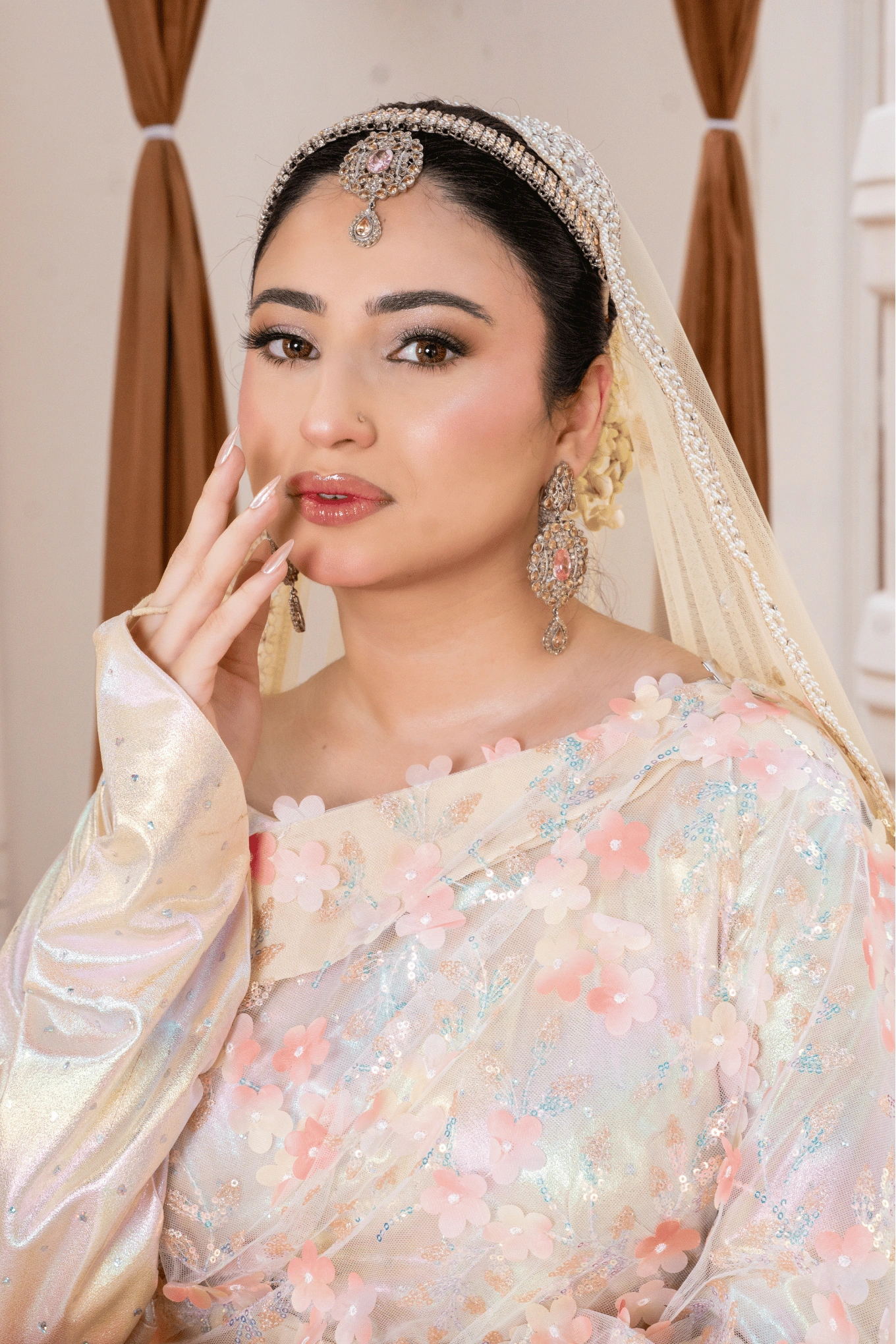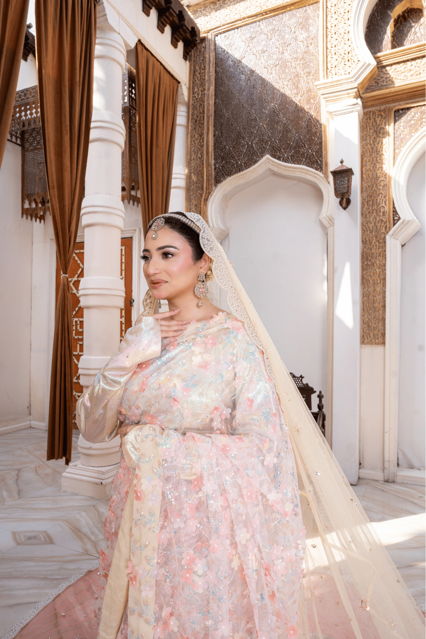 A double-shaded soft net nikkah dress with 3D floral embroidery, sitara work, and a three-tone attached veil with crystal ada border and scalloped lace edging.