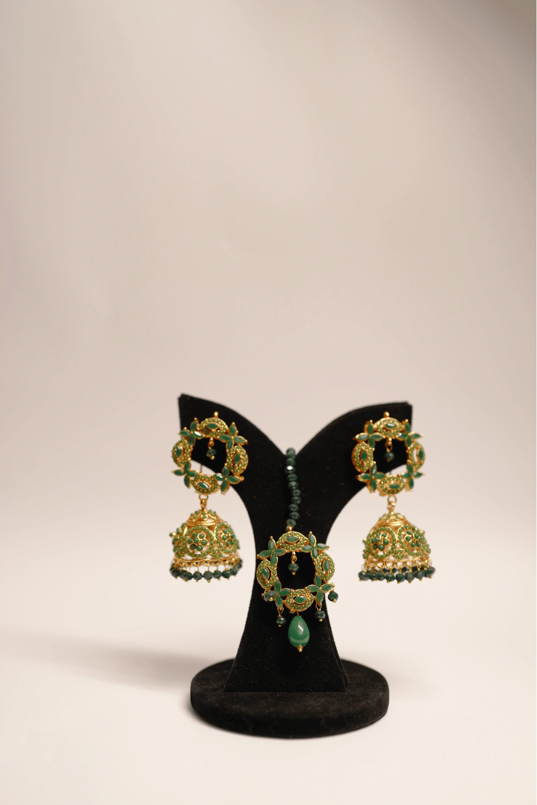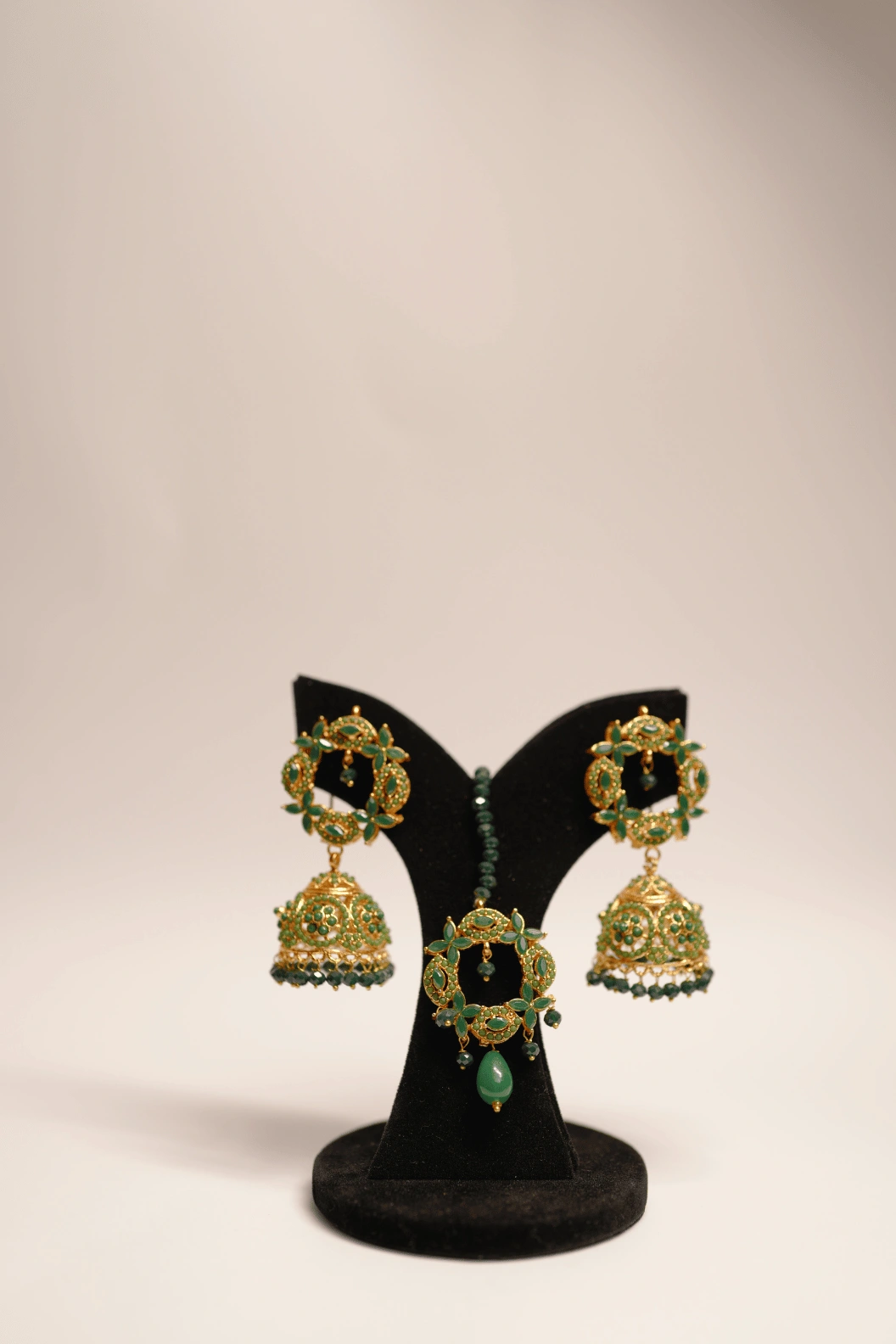 A gold plated bindi and earring set with deep green stone accents. Crafted in brass alloy. Designed for nikkah, bridal, and formal occasions.