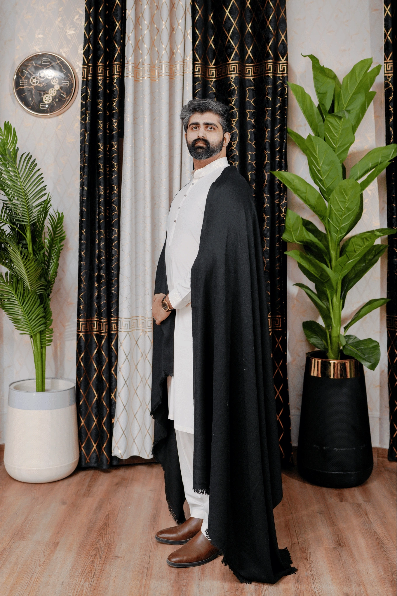 A luxury wool shawl for men in black. Warm, bold, and suited for formal and festive occasions. A strong, versatile winter staple for the modern Pakistani man.