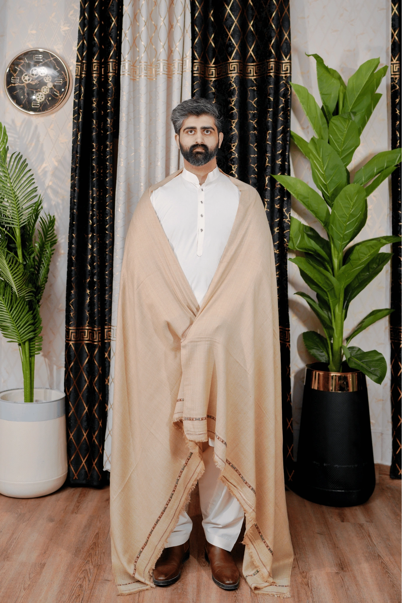 A luxury wool shawl for men in camel. Warm, refined, and suited for formal and festive occasions. A classic winter staple for the modern Pakistani man.