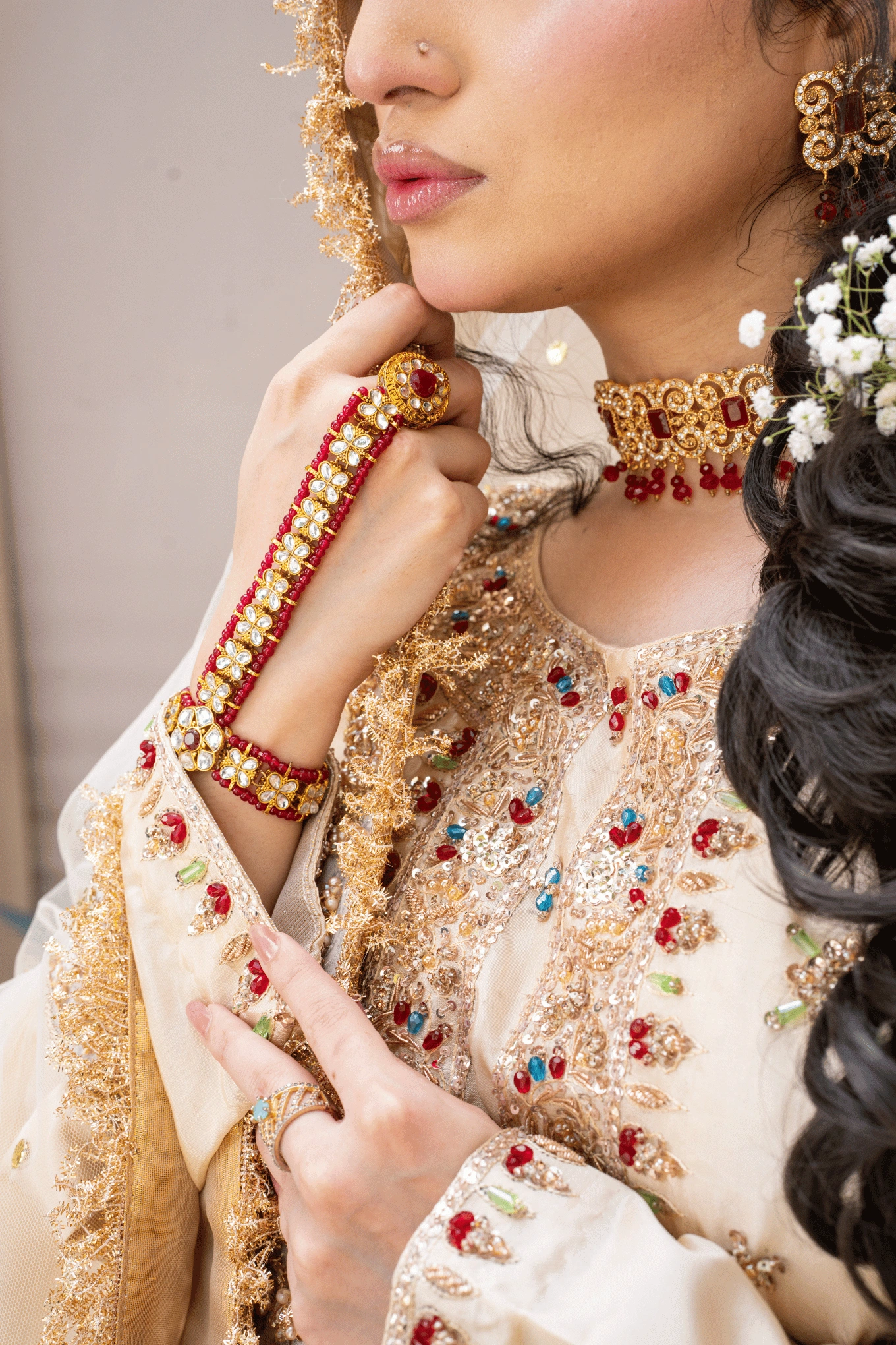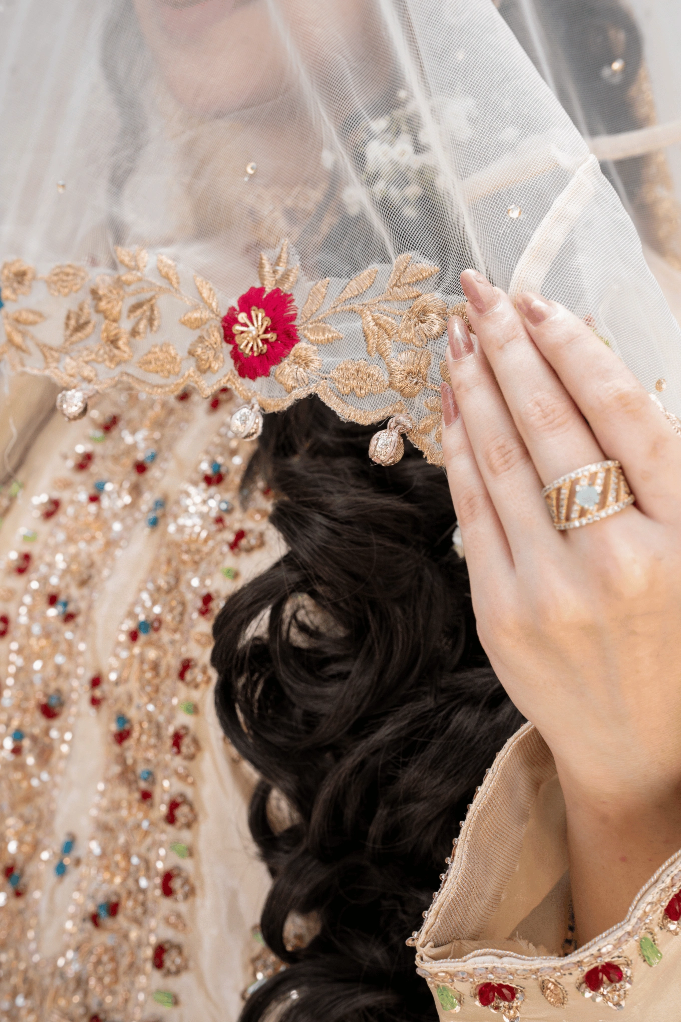 Noor-e-Nikkah is crafted for the bride who carries tradition with confidence. The kathan silk shirt is worked with dabka, naqshi, sequins, and crystals, building a surface that is deeply detailed and luminous. The Banarsi sharara or pajama features handmade lace detailing that honors the heritage of the fabric. The dupatta is finished with muqesh chata work and heavy borders edged with kiran lace. The matching veil carries embroidered borders and tassel finishing, completing an ensemble built entirely around the art of handcraft.