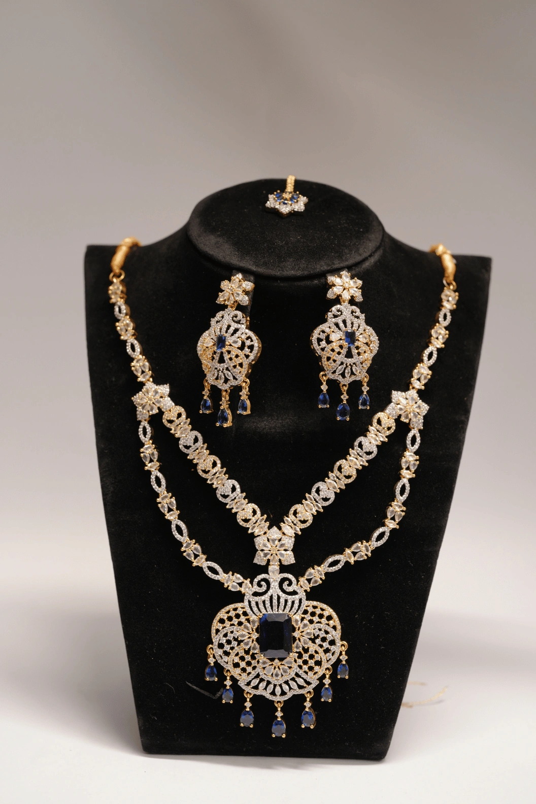 A luxury 1 karat gold haar set with blue sapphire and crystal rhinestones. Includes matching earrings and bindi. Comes in brand box packing. Designed for bridal and formal occasions.