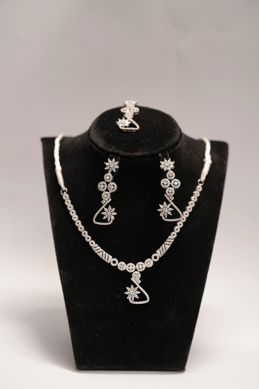 A luxury 1 karat white gold haar set with diamante and crystal rhinestones. Includes matching earrings and bindi. Comes in brand box packing. Designed for bridal and formal occasions.