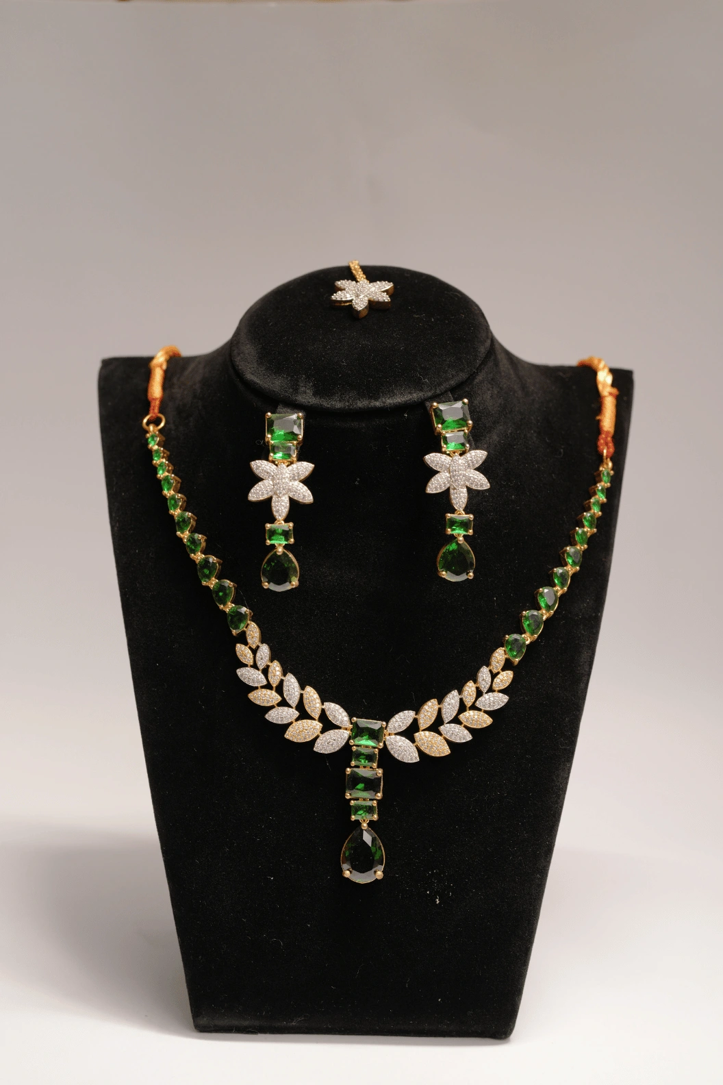 A luxury 1 karat white gold haar set with emerald and crystal rhinestones. Includes matching earrings and bindi. Comes in brand box packing. Designed for bridal and formal occasions.