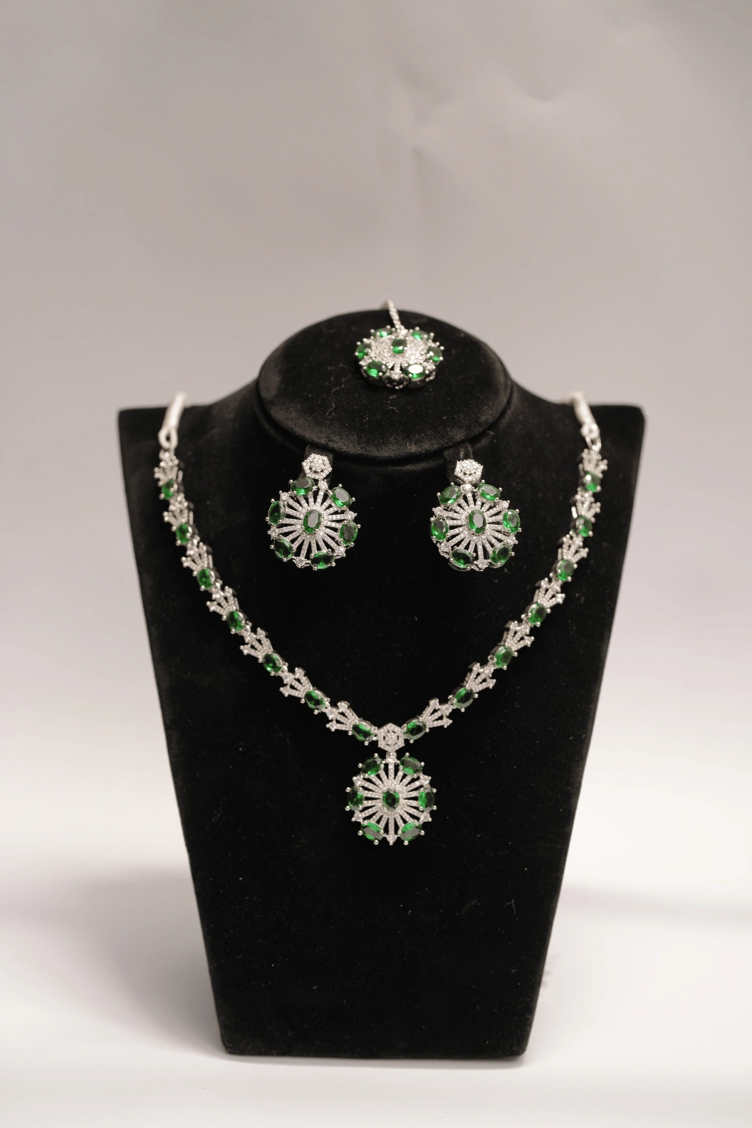 A luxury 1 karat white gold haar set with emerald and crystal rhinestones. Includes matching earrings and bindi. Comes in brand box packing. Designed for bridal and formal occasions.
