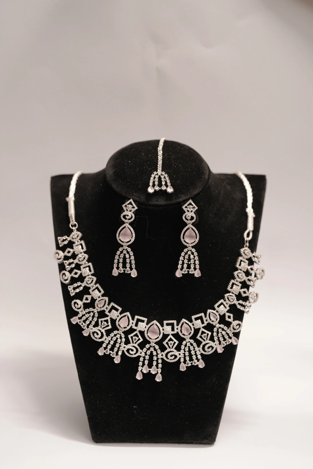 A luxury 1 karat white gold haar set with morganite stone and crystal rhinestones. Includes matching earrings and bindi. Comes in brand box packing. Designed for bridal and formal occasions.