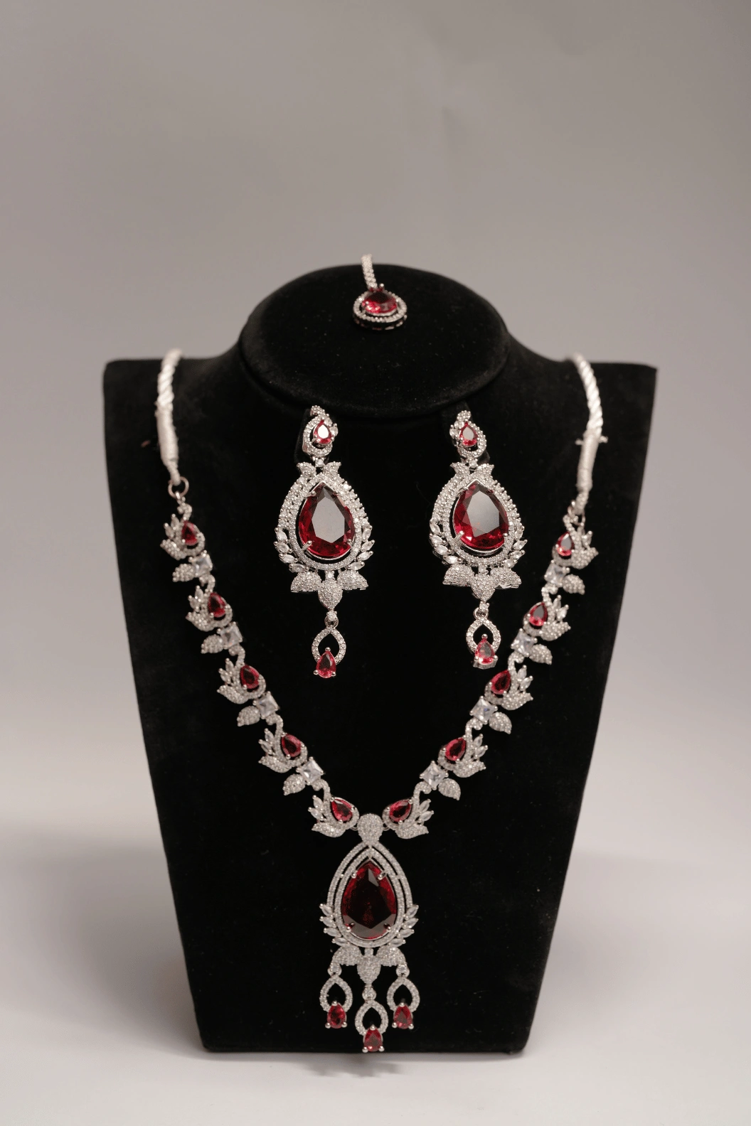 The Noor Haar Set in Ruby Red is a luxury jewellery set crafted in 1 karat white gold with ruby stones and crystal rhinestones. Ruby is one of the most classic bridal stones, and set against white gold it delivers a bold, timeless look. The collar necklace carries detailed hangings that add richness to the overall silhouette. The set includes a matching pair of earrings and a bindi. A strong choice for nikkah and bridal wear in red, maroon, and ivory. Every piece arrives in Noor-e-Alam brand box packing.
