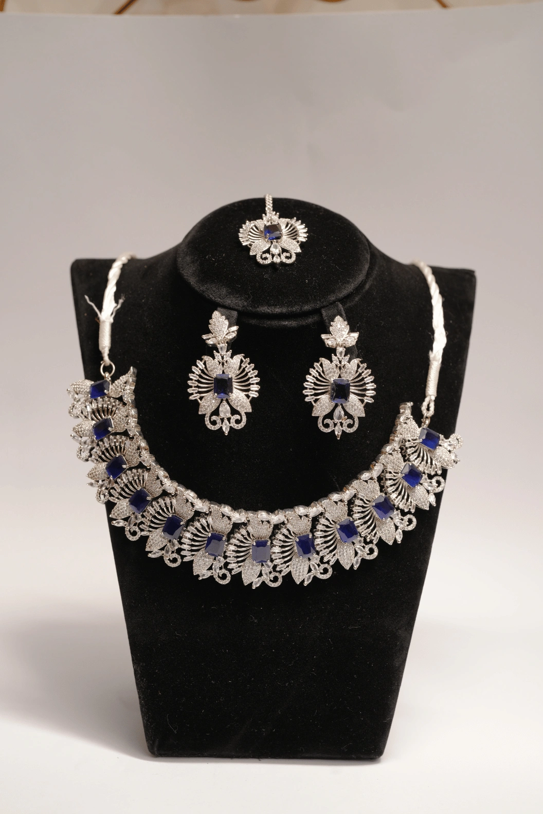 A luxury 1 karat white gold haar set with sapphire and crystal rhinestones. Includes matching earrings and bindi. Comes in brand box packing. Designed for bridal and formal occasions.