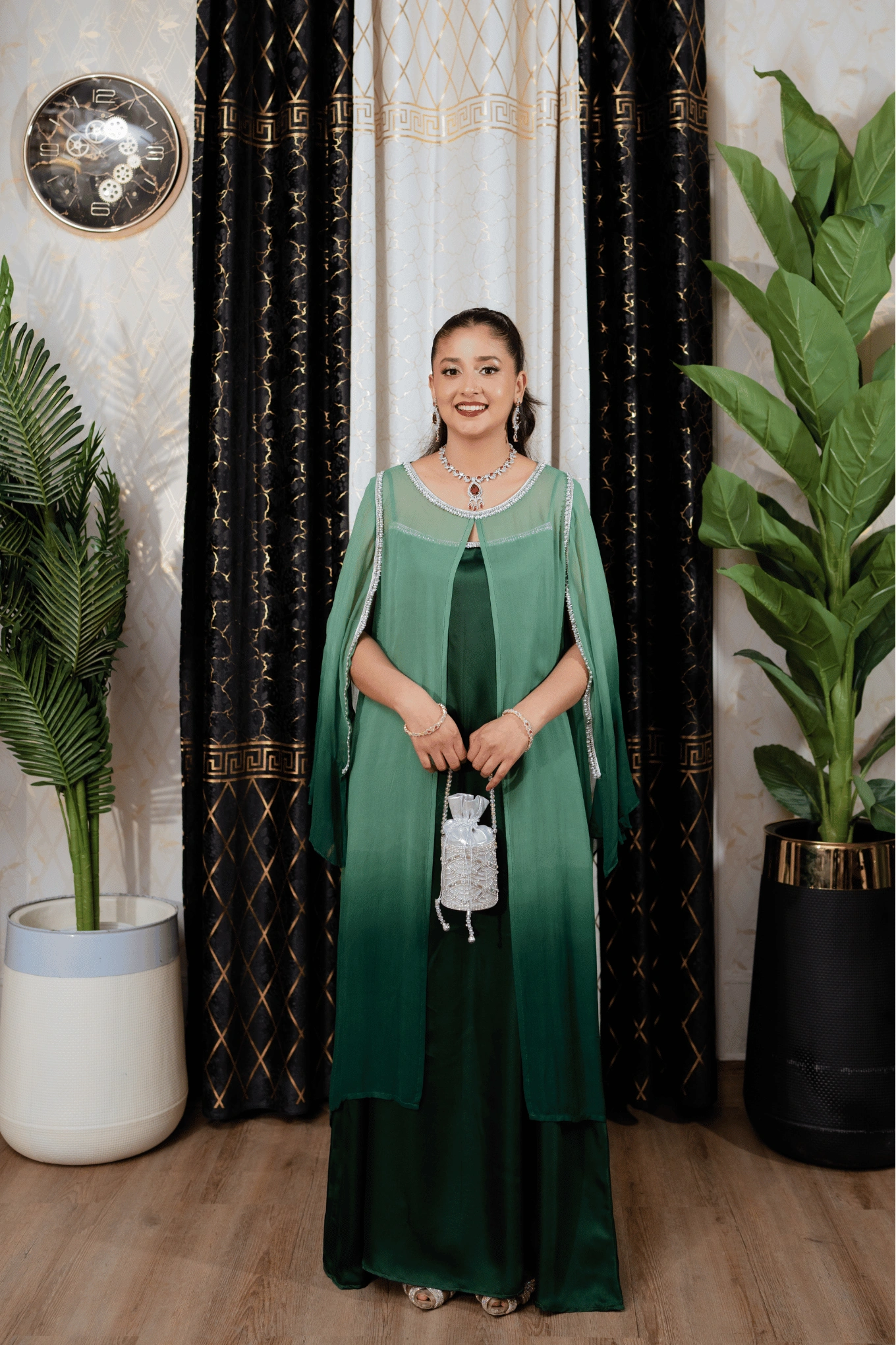 A green ombre ensemble featuring a sleeveless inner silk gown with plain trousers, layered with a flowy chiffon gown with ruffled sleeves and slit openings. Crystal embellishments on the inner neckline and crystal lace detailing on the outer gown.