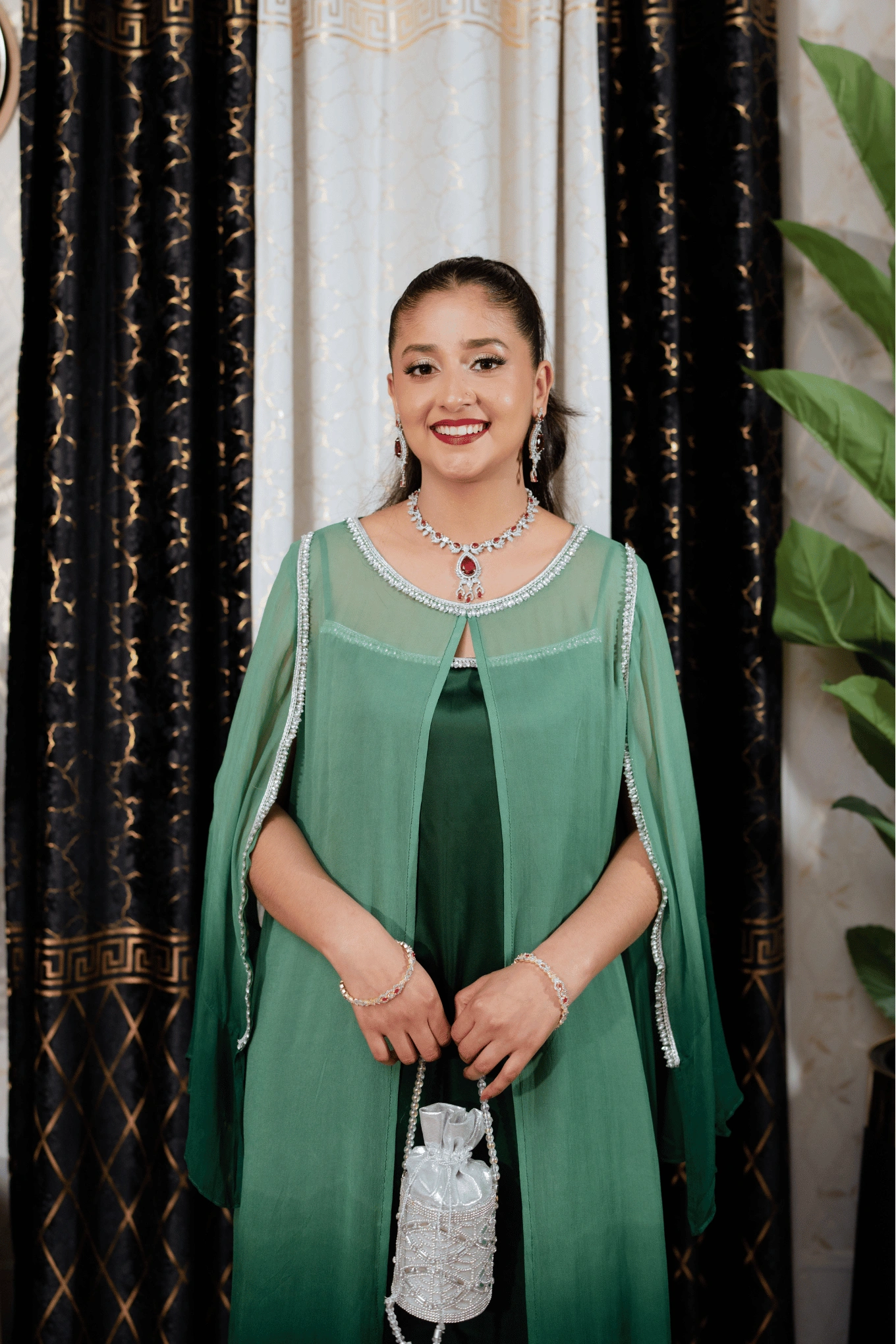 This green ombre ensemble features a sleeveless inner silk gown in a deeper shade of green, paired with plain trousers for a clean base. Layered over it is a flowy chiffon gown with ruffled sleeves and slit openings that add movement and dimension to the silhouette. The inner neckline is embellished with crystals, while the outer chiffon gown is detailed with crystal lace along the neckline and slits. A blend of ombre hues, layered textures, and sparkling embellishments that comes together for a luxurious, festive look. Suited for Eid, walima, and formal evening occasions.