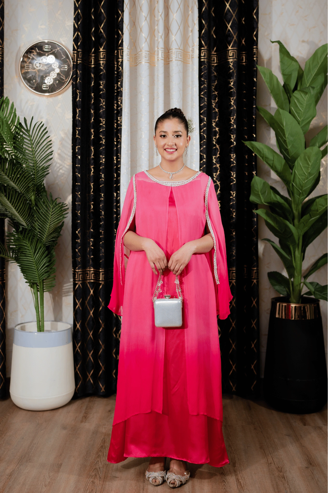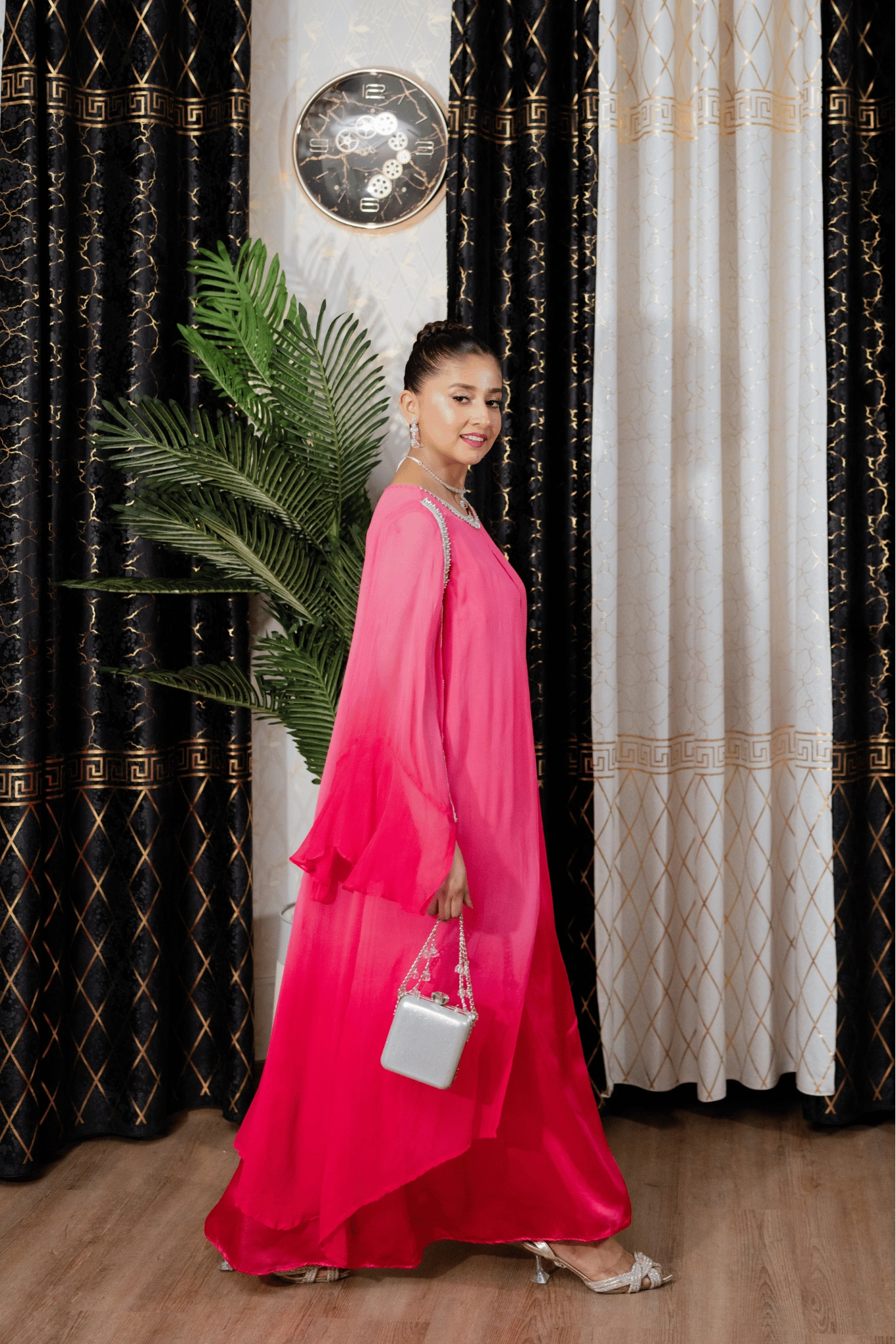 This pink ombre ensemble features a sleeveless inner silk gown in a deeper shade of pink, paired with plain trousers for a clean base. Layered over it is a flowy chiffon gown with ruffled sleeves and slit openings that add movement and dimension to the silhouette. The inner neckline is embellished with crystals, while the outer chiffon gown is detailed with crystal lace along the neckline and slits. A blend of ombre hues, layered textures, and sparkling embellishments that comes together for a luxurious, festive look. Suited for Eid, walima, and formal evening occasions.