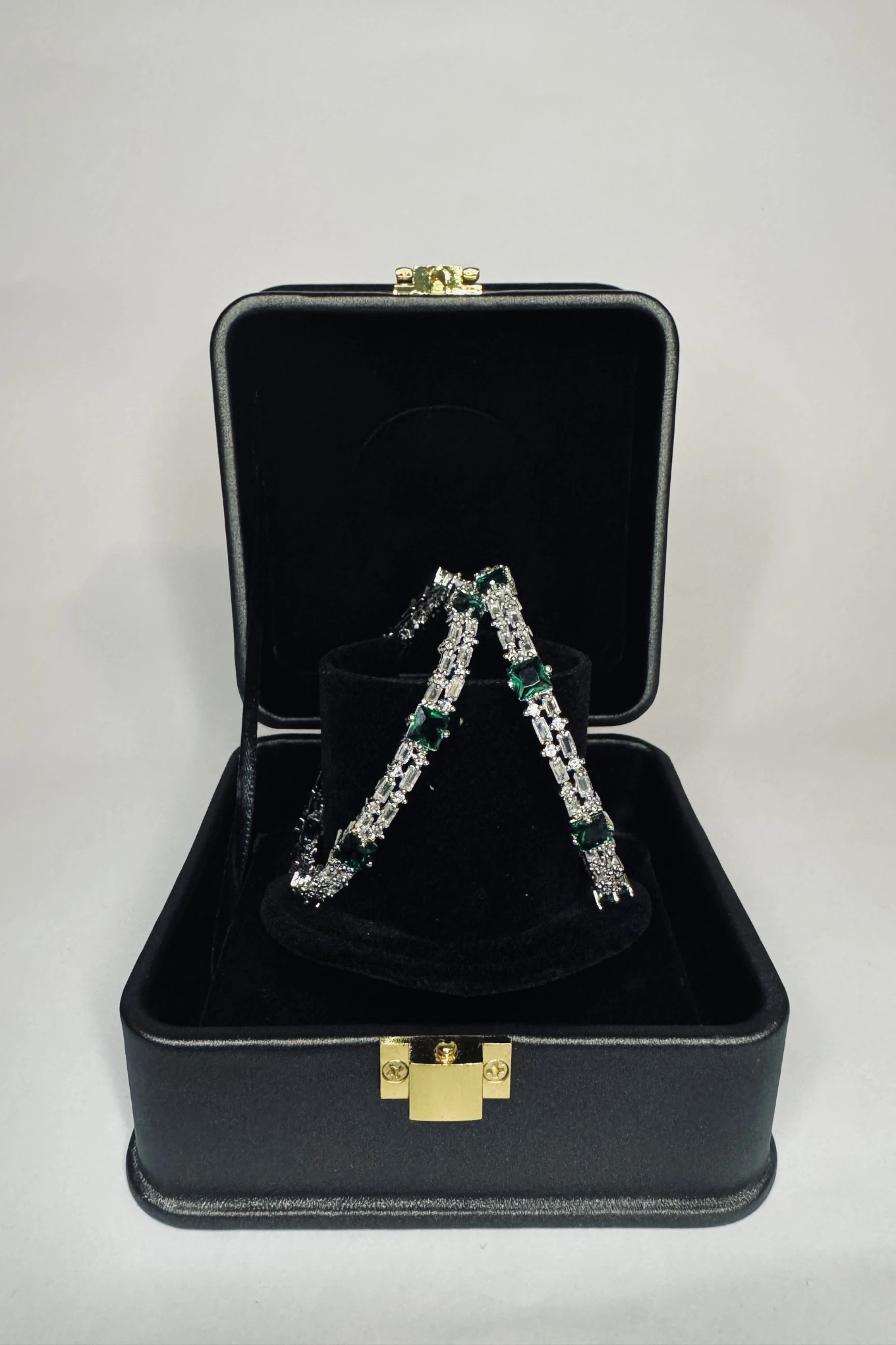 A rhodium plated silver bangle with silver, green, and white stone detailing. Inner diameter 2.5 inches. Crafted in brass alloy. Suited for formal, bridal, and festive occasions.