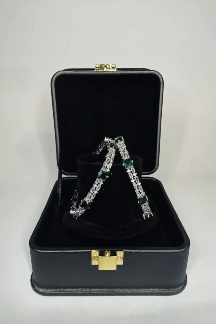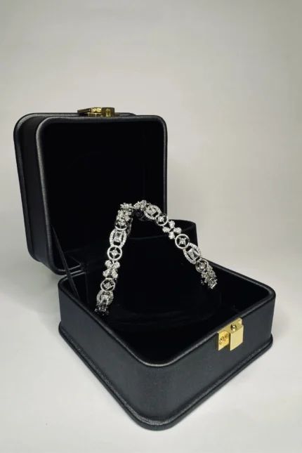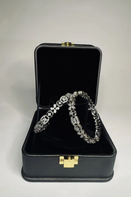 A rhodium plated silver bangle with silver stone detailing. Inner diameter 2.5 inches. Crafted in brass alloy. Suited for formal, bridal, and festive occasions.