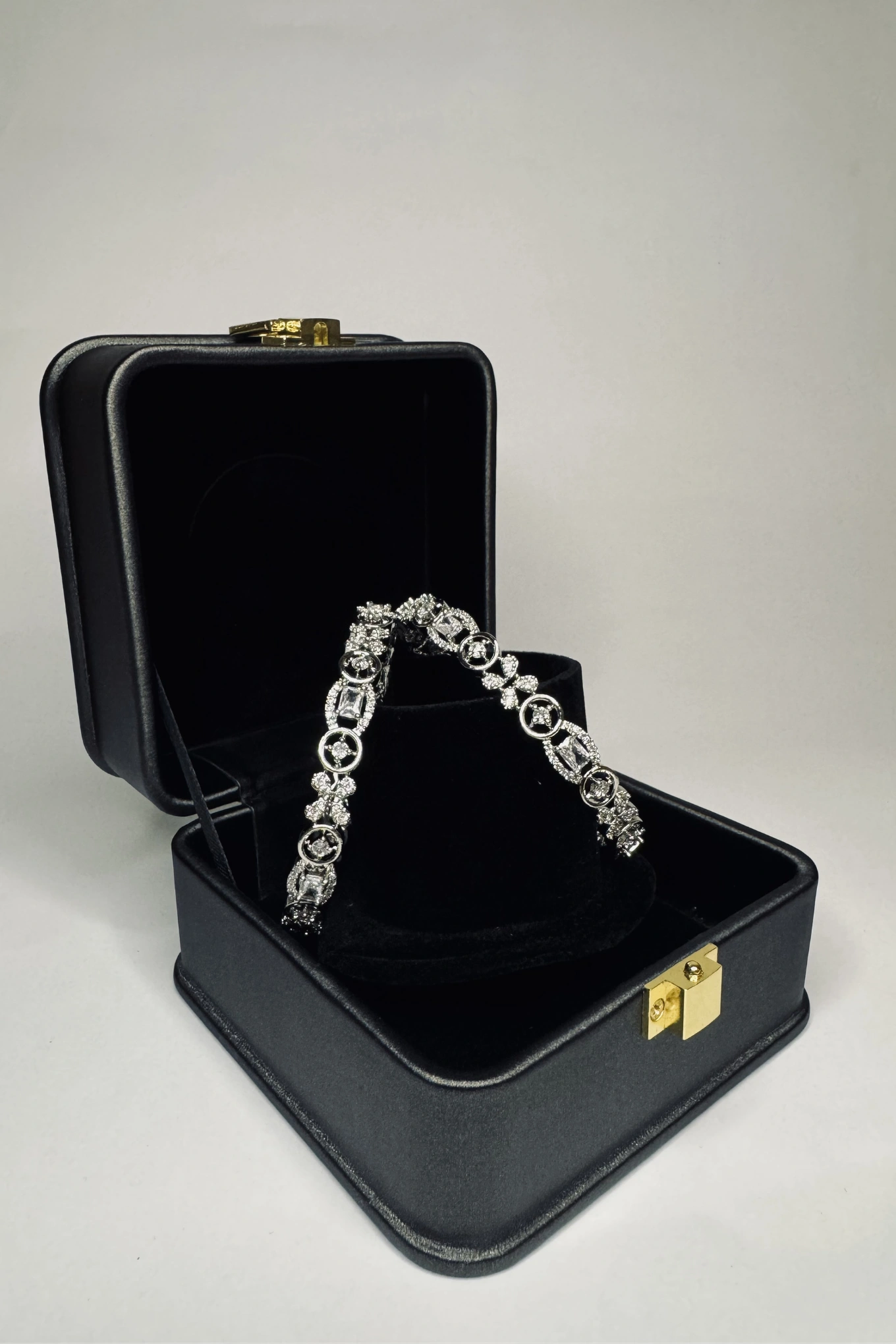 A rhodium plated silver bangle with detailed silver stone embellishments. Inner diameter 2.5 inches. Crafted in brass alloy. Suited for formal, bridal, and festive occasions.
