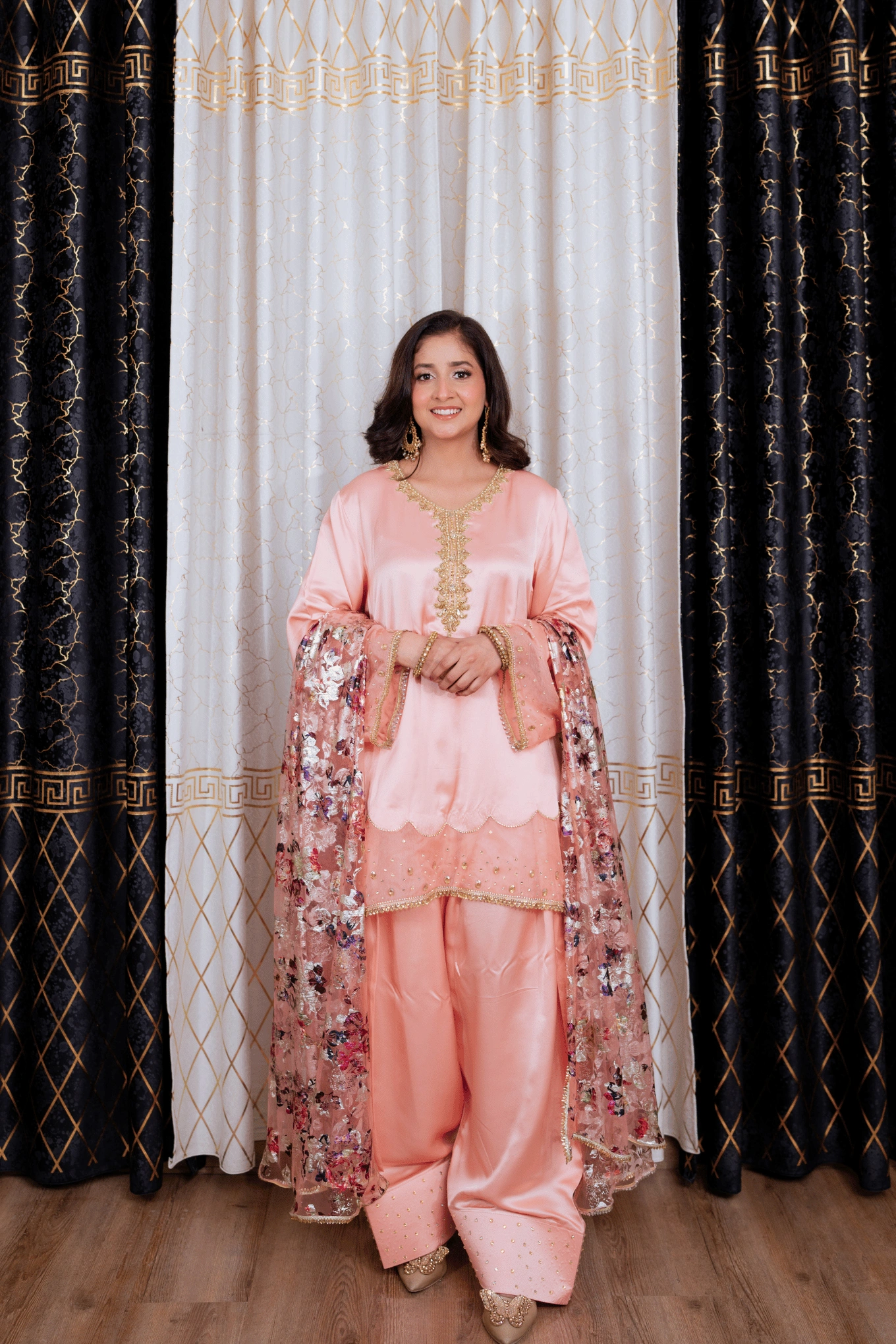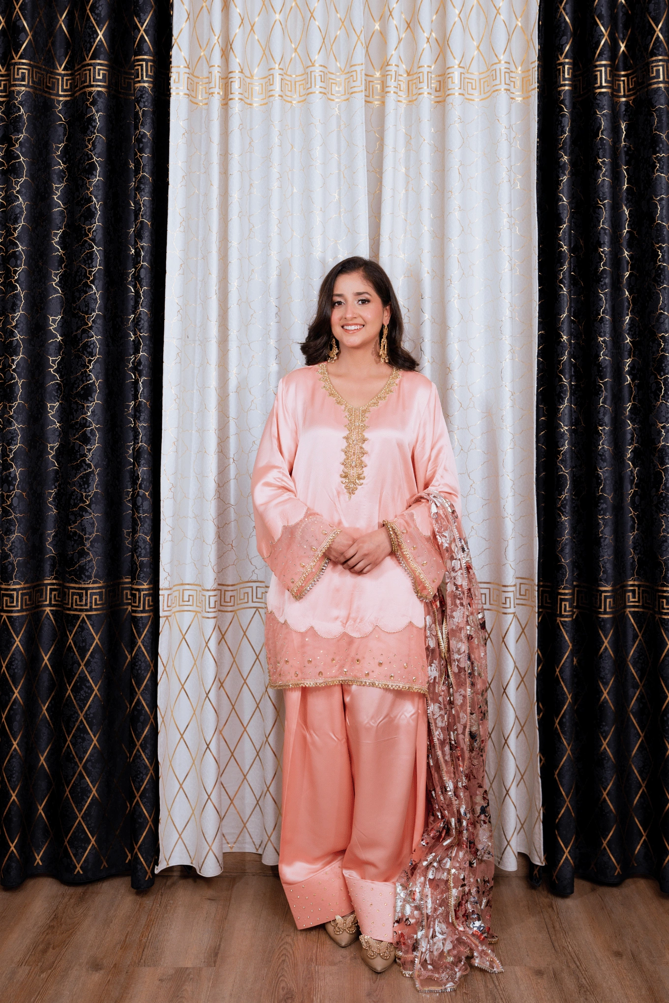 This peach ensemble is crafted from premium satin silk, featuring a short shirt paired with a classic farshi shalwar for a timeless, graceful silhouette. The hand-embellished neckline showcases intricate kora and dabka work, complemented by organza patchwork on the daman and sleeves. Crystal and stone chain detailing enhances the scalloped edges, with matching embellishment carried through to the shalwar hemline for a cohesive, polished finish. A shimmery net dupatta with lace-edged finishing completes this refined and elegant look. A perfect choice for Eid, formal gatherings, and festive occasions.