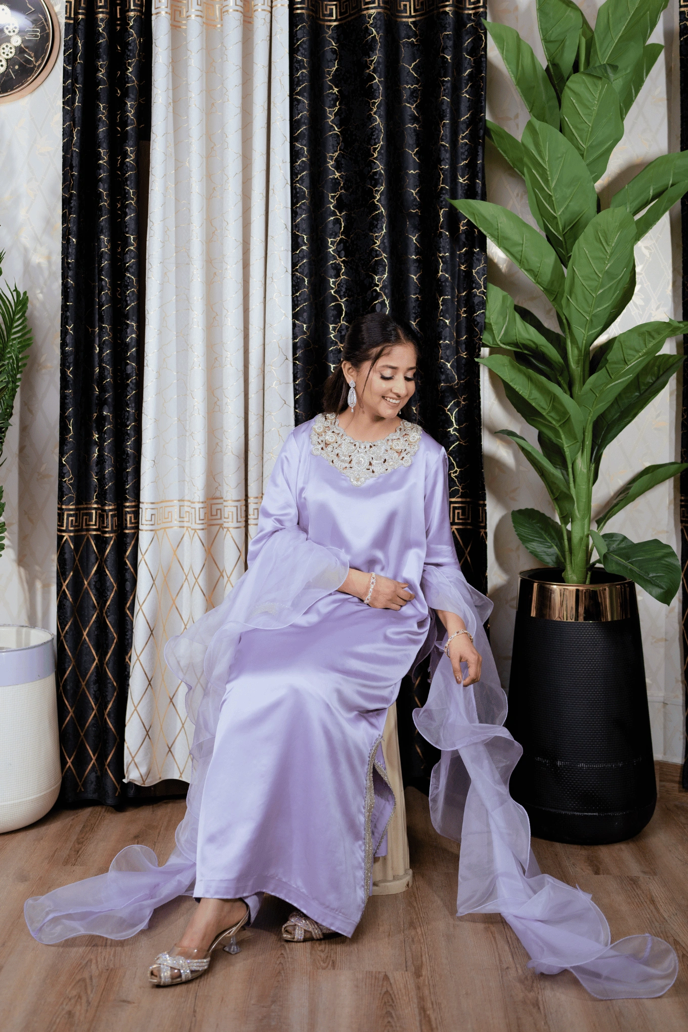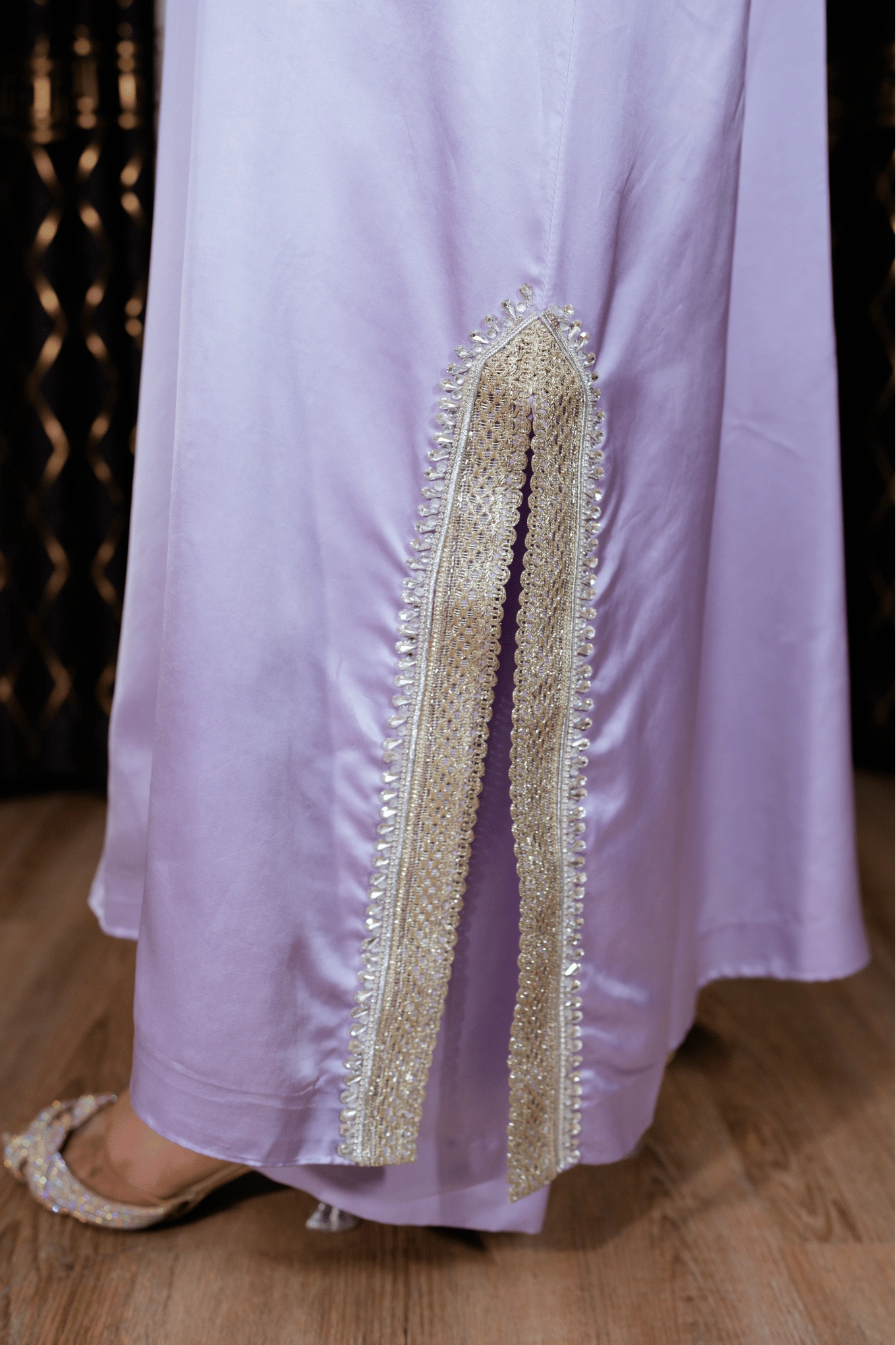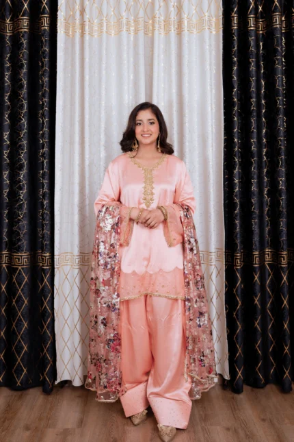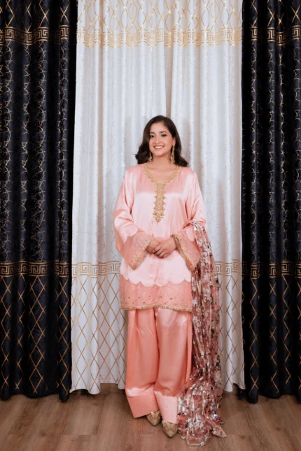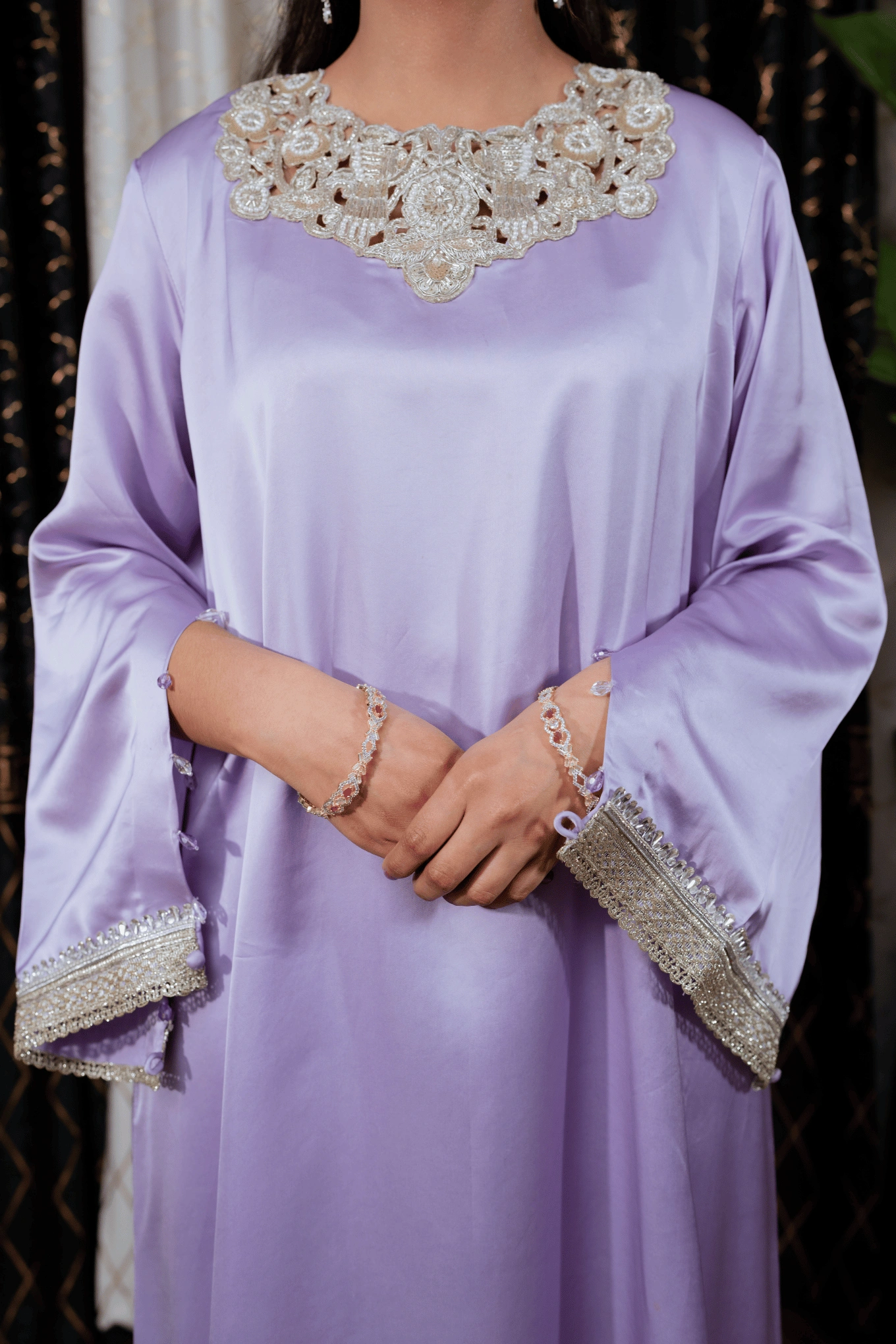 This lilac ensemble is crafted from premium satin silk, featuring a long shirt paired with flapper trousers for a modern and elegant silhouette. The handmade cutwork neckline in contrasting silver and gold tones is enhanced with lace and crystal detailing on the lower front panel of the shirt. The sleeves are adorned with lace and crystal work and feature slit cuts with tassel embellishments along the edges, adding a sophisticated touch. The look is completed with a ruffled organza dupatta, bringing soft volume and delicate elegance to the ensemble. Suited for Eid, formal dinners, and festive occasions.