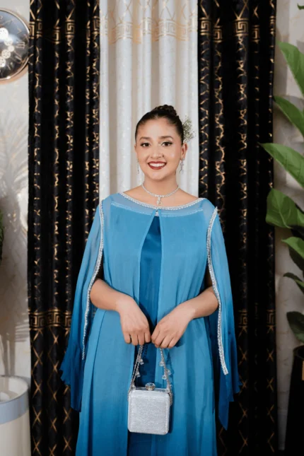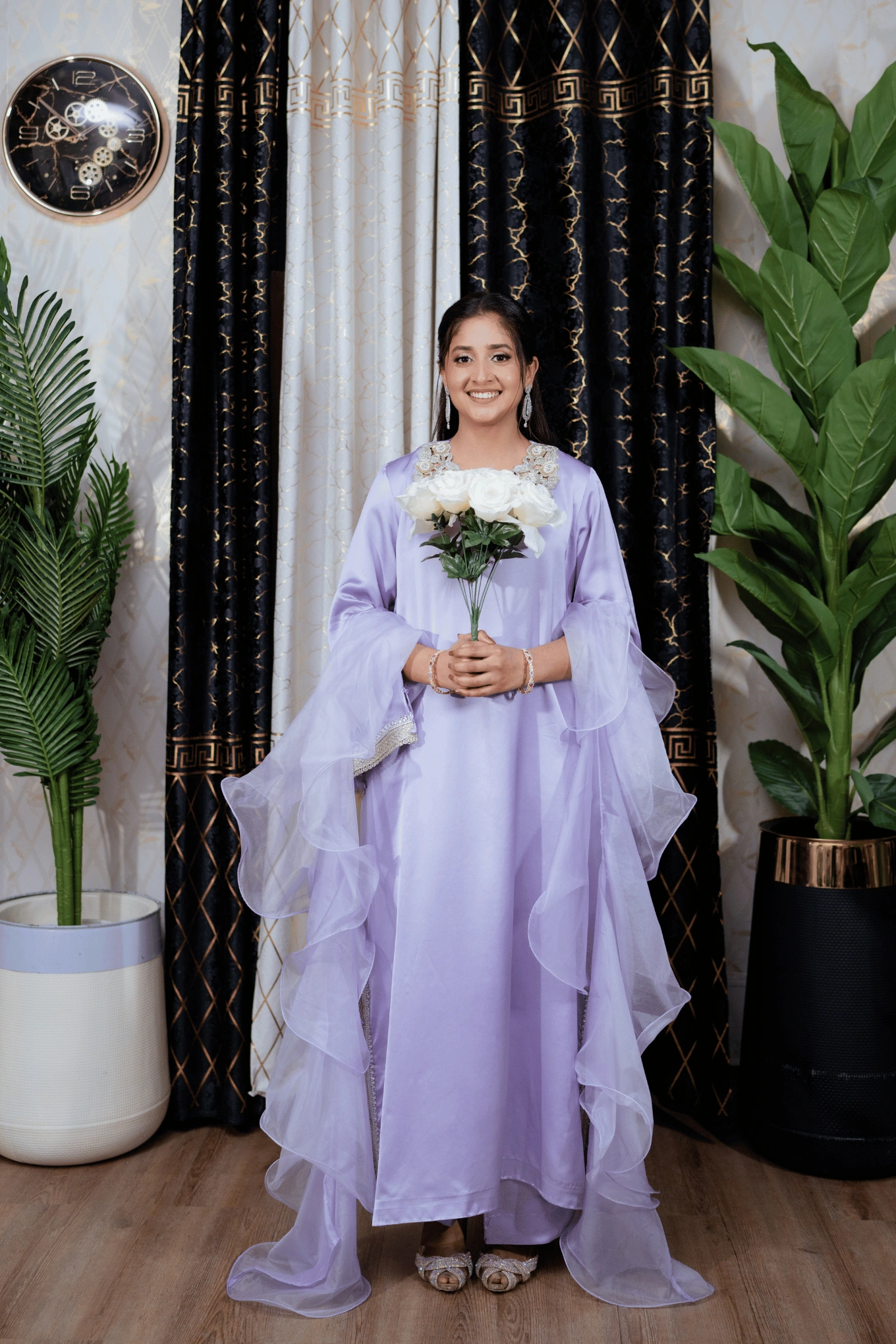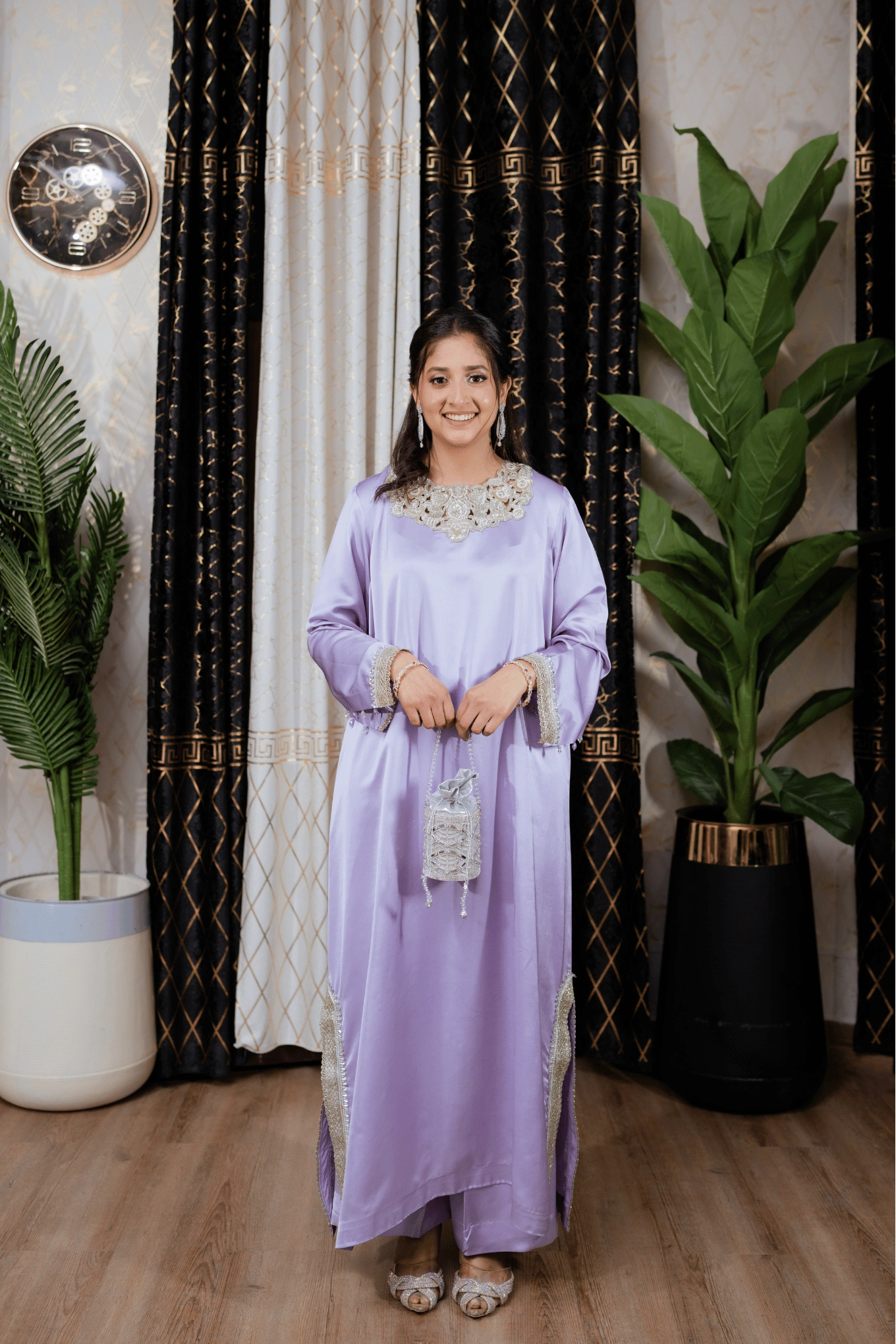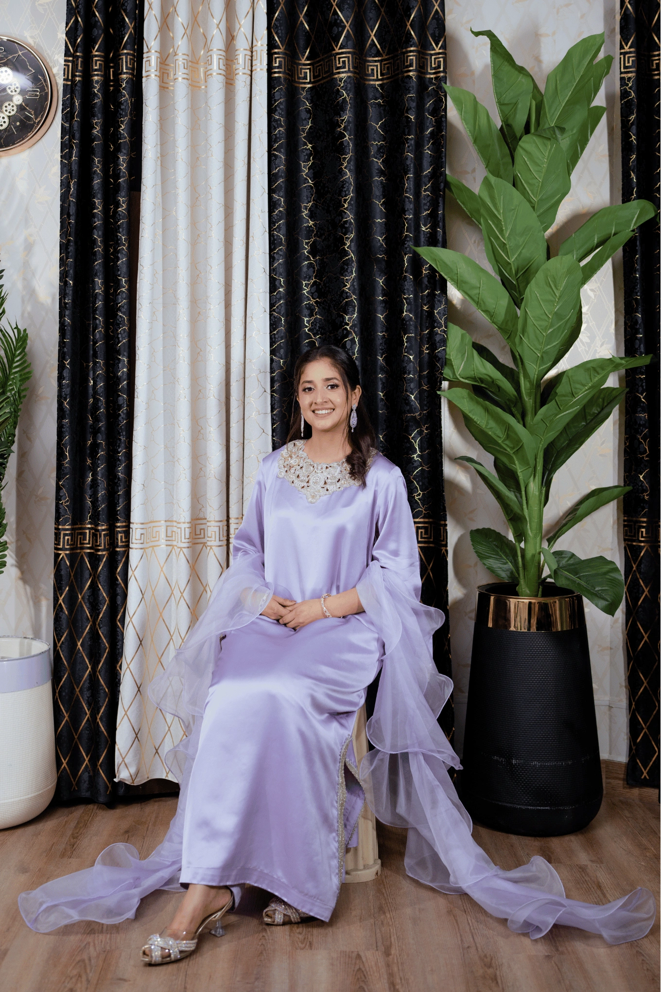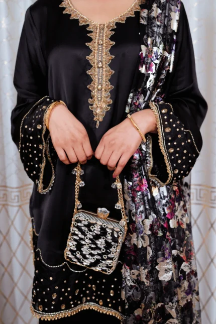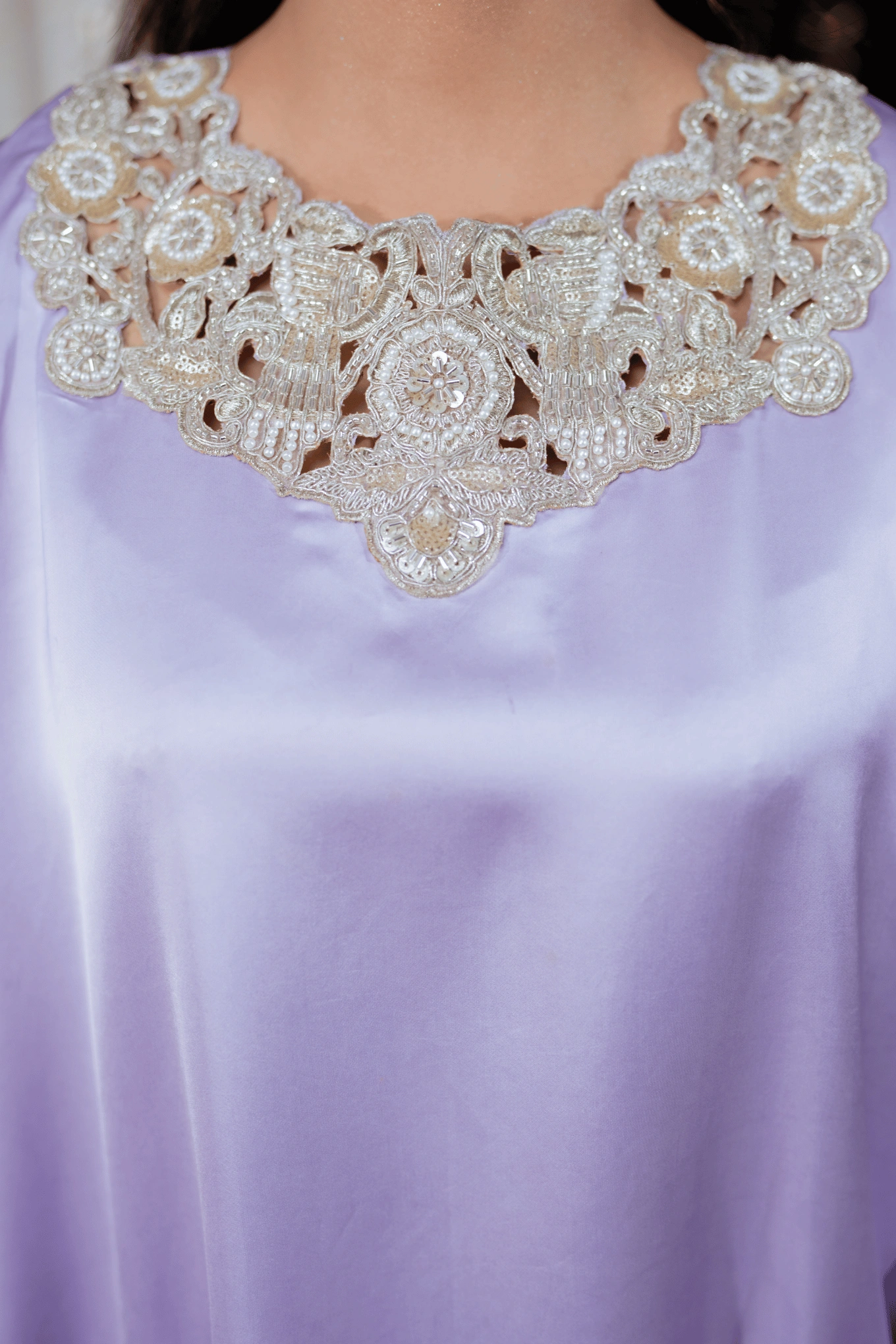 This lilac ensemble is crafted from premium satin silk, featuring a long shirt paired with flapper trousers for a modern and elegant silhouette. The handmade cutwork neckline in contrasting silver and gold tones is enhanced with lace and crystal detailing on the lower front panel of the shirt. The sleeves are adorned with lace and crystal work and feature slit cuts with tassel embellishments along the edges, adding a sophisticated touch. The look is completed with a ruffled organza dupatta, bringing soft volume and delicate elegance to the ensemble. Suited for Eid, formal dinners, and festive occasions.