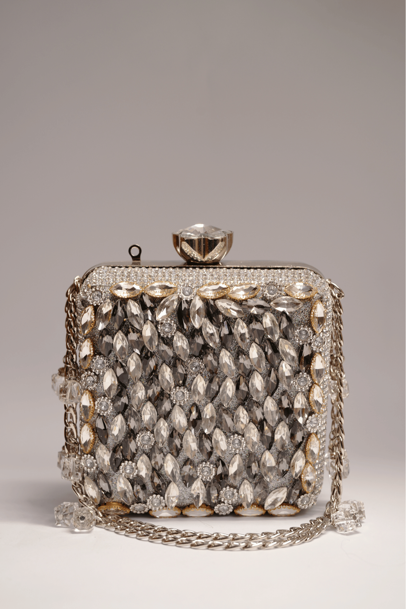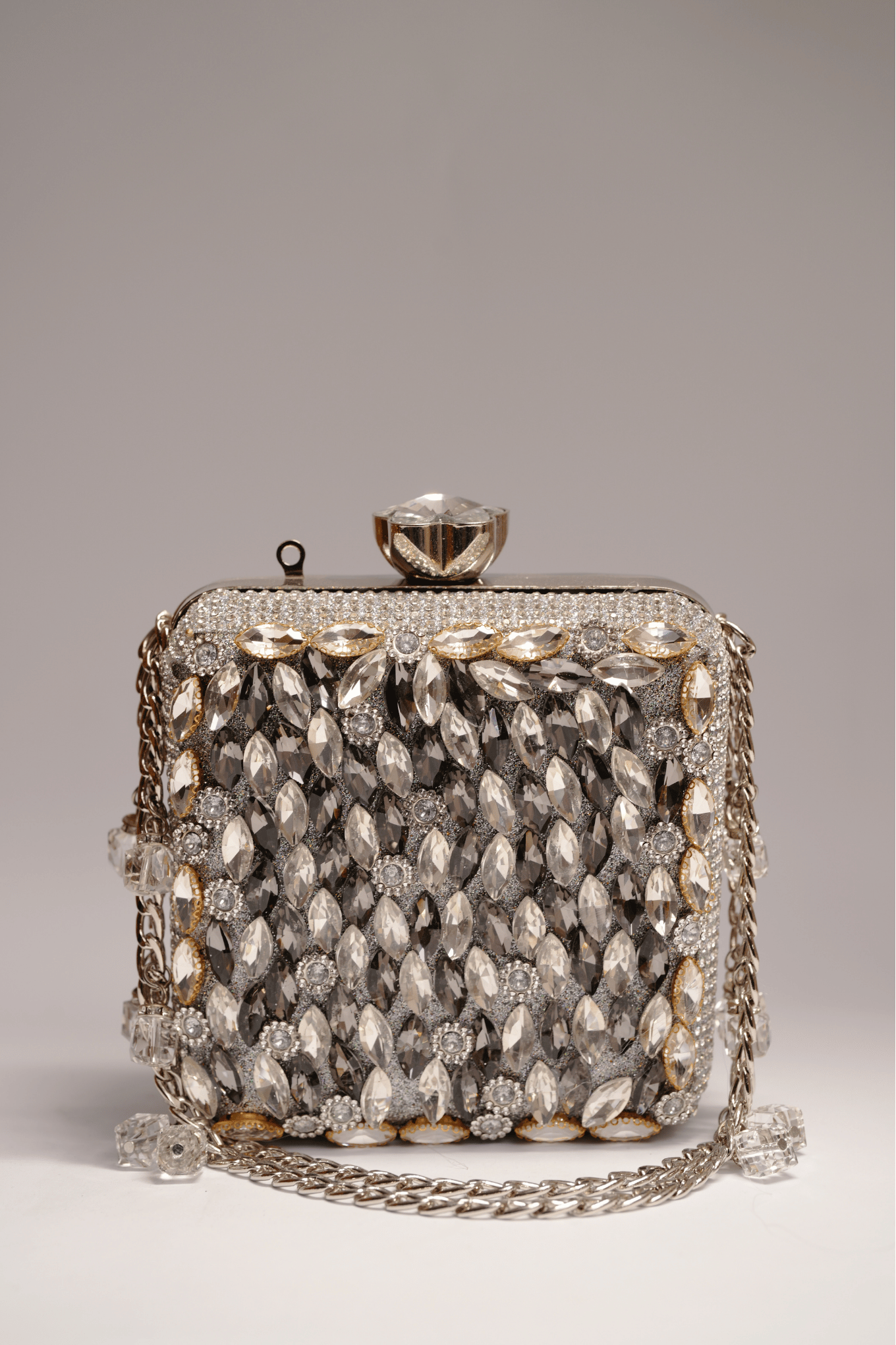 A structured silver evening clutch with large diamond stone embellishments, crystal clasp, and a silver chain strap. Sized at 13H x 13W cm. Suited for weddings, formal dinners, and festive occasions.