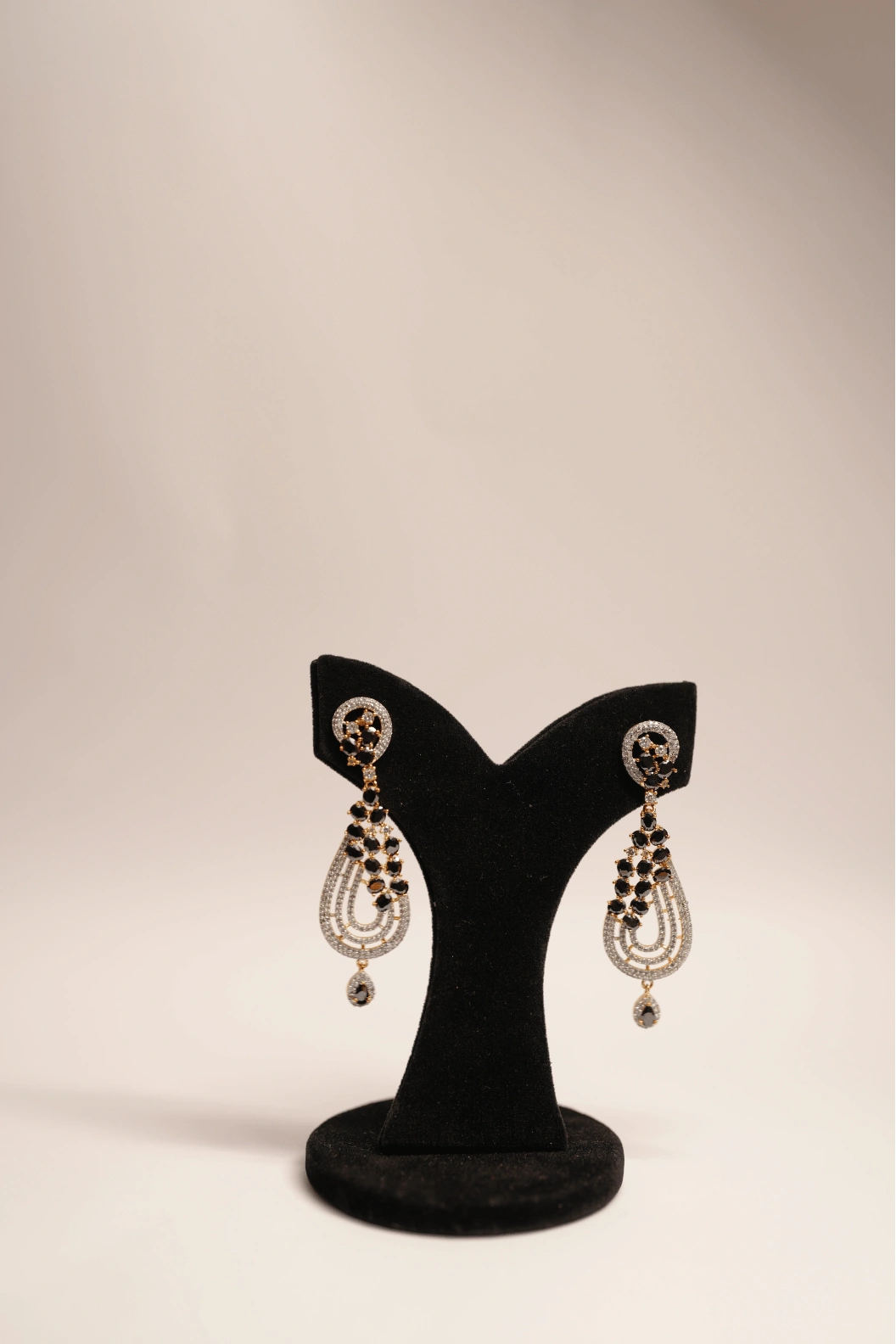 A silver and gold dual-tone earring set with silver and black stone accents. Rhodium plated brass alloy. Suited for formal, festive, and evening occasions.