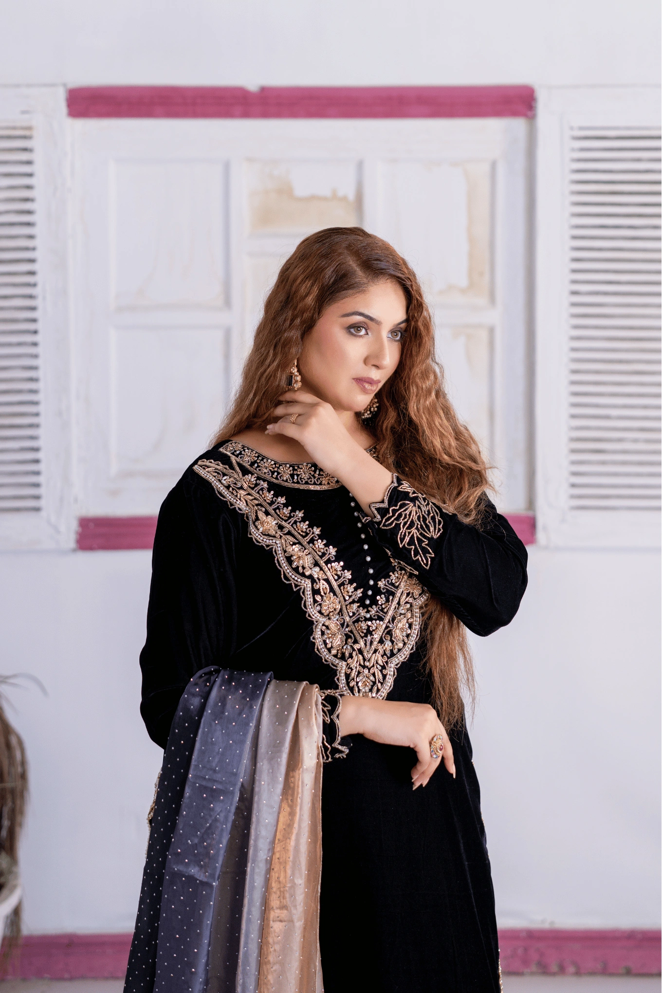 A black velvet shirt with dabka, naqshi, zardozi, and crystals, paired with straight chanderi silk trousers and a golden-black silk dupatta with chata-patti work.