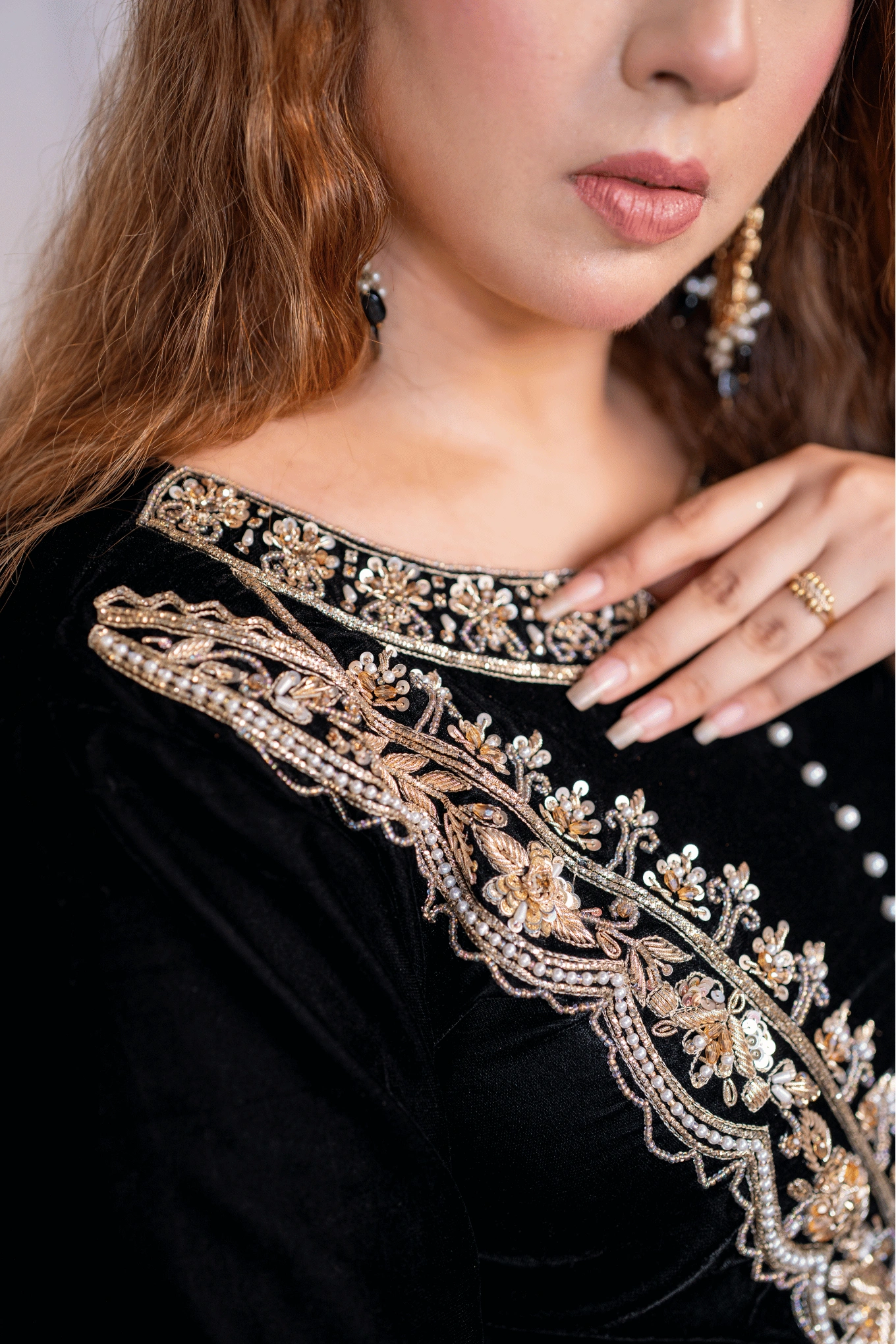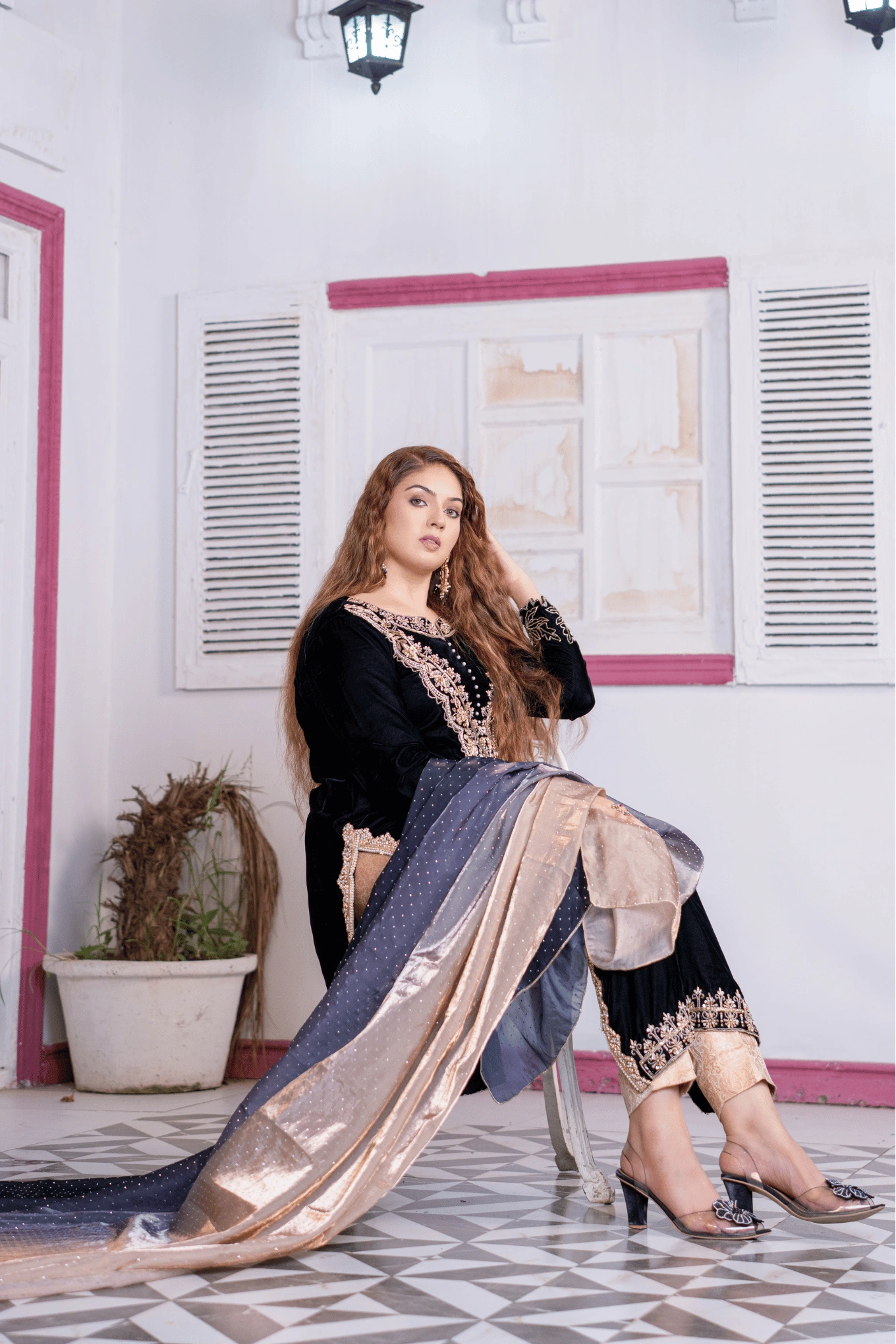 Velora brings the weight and richness of velvet into a formal look built around traditional handcraft. The black velvet shirt is adorned with dabka, naqshi, zardozi, and crystals, with back tassels and chanderi borders completing the design. The straight chanderi silk trousers offer a clean, modern silhouette that balances the richness of the shirt. The golden-black silk dupatta carries chata-patti work throughout, tying the look together with a bold, classic finish. Velora is for the woman who wears craft as a statement.