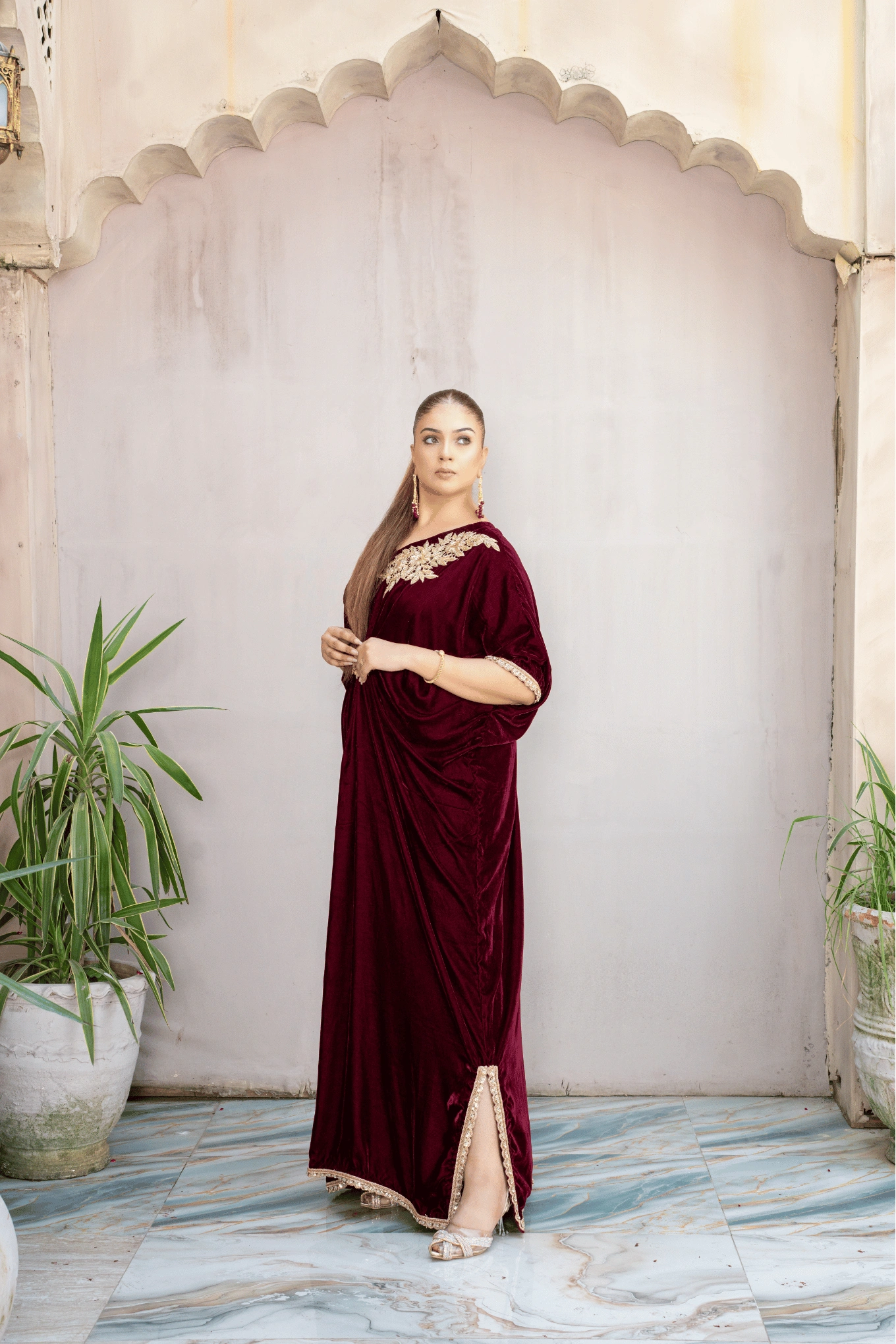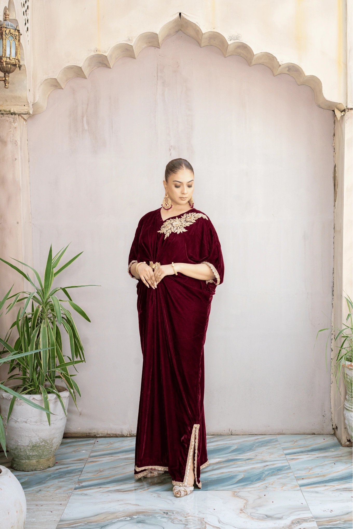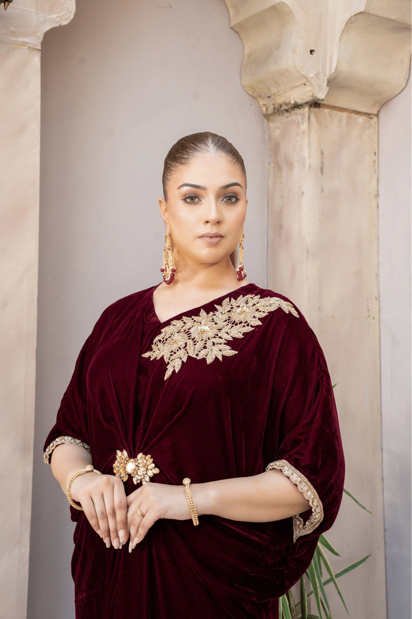 A mehroon velvet dress with a hand-embroidered golden shoulder motif, crystal waist brooch, pleated drapes, and edges finished with delicate handmade lace.